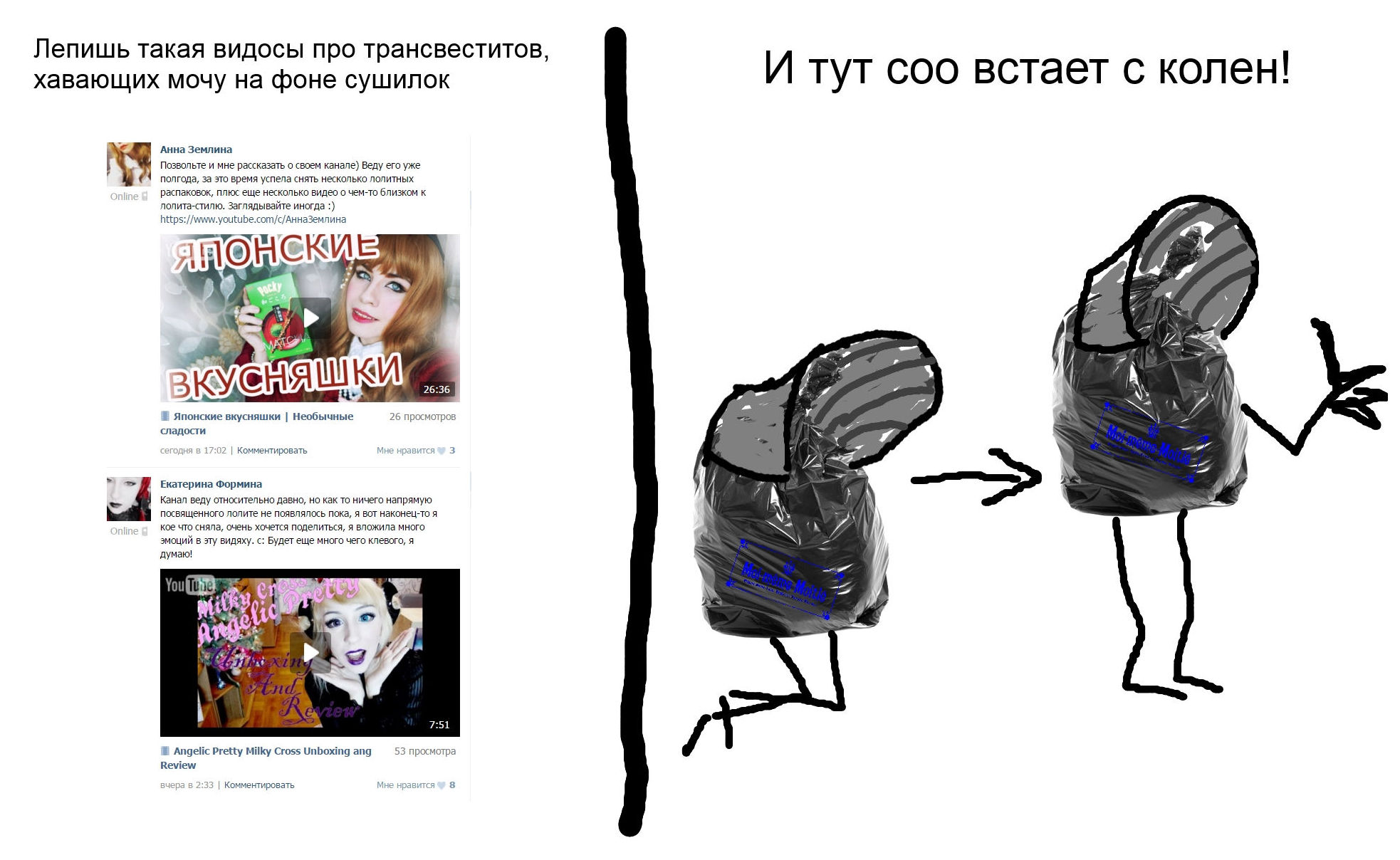 >>41755 >Не вижу я "многих" людей. Мимокров навалом, а вот тех кто задерживается очень мало. И к сожалению, люди уходят именно из-за отсутствия выраженной атмосферы субкультуры. Они видят милые картинки, видосы, приходят, а им начинают ссать в глаза и срать в уши всякие неадекватные феминистки, бодипозитивистки, лесбиянки-малолетки, нетакиекаквсе и прочие вниманиебляди, которые лезут в каждую бочку затычкой со своим демотивирующим мнением. Потом нюфани приходят на мит, в надежде что ну хоть там может быть найдут атмосферу, но видят что олдфаги просто сидят в кружочек и обсуждают недавнюю попойку или актёра. И кто же в итоге остаётся? Только аутистки которые привыкли всегда быть одни и им по фану даже просто выйти из дома. И эта херня у нас продолжается уже очень давно. Но я конечно же не предлагаю говорить о поэзии, мне она тоже до пизды.То есть, я хочу сказать ещё такую важную вещь, в сообществе всегда отсутствовала вменяемая модерация. Люди как бы добровольно взявшие на себя роль смотрителей нихера не делали. Мол: "ну она же не нарушает правила, зачем прогонять? У нас так людей не останется.", вот их и не осталось. А то что разные паразиты отравляют атмосферу и сеют раздор, убивают мотивацию это разве хорошо? И никто им даже замечания не делает. Никто не обращает внимания на лютый оффтоп, типа: "женщина не должна", который из некоторых так и прёт... Никто вообще не фильтрует своё и чужое поведение на предмет соответствия месту и действию. Как говорят у программистов: мусор на входе — мусор на выходе.