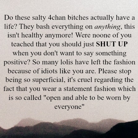 И очень хорошо, что есть лолиты, для которых данный стиль это приятное дополнение, а не отдушина из мира депрессий и неудач. И очень жаль, что фальшивые принцессы столь долго контролировали наше сообщество, пытаясь поддерживать иллюзию своего успеха. Надеюсь что добрые и открытые люди скоро соберутся и возродят сообщество (а не "соо"-огрызок). И ЧСВэшные нищебляди не получат в нём административных прав.