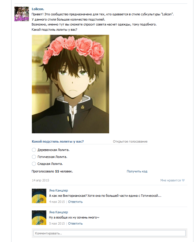 >>41725 >группа в контактике Речь не о группе. Кому она нужна вообще? Речь о личном знакомстве, о том что бы вернуться к тому, с чего всё началось — с дружбы основанной на взаимном интересе к определённому стилю одежды, жизни, образа мысли. Без примеси этого "я крутая, я в лоли и бухая".