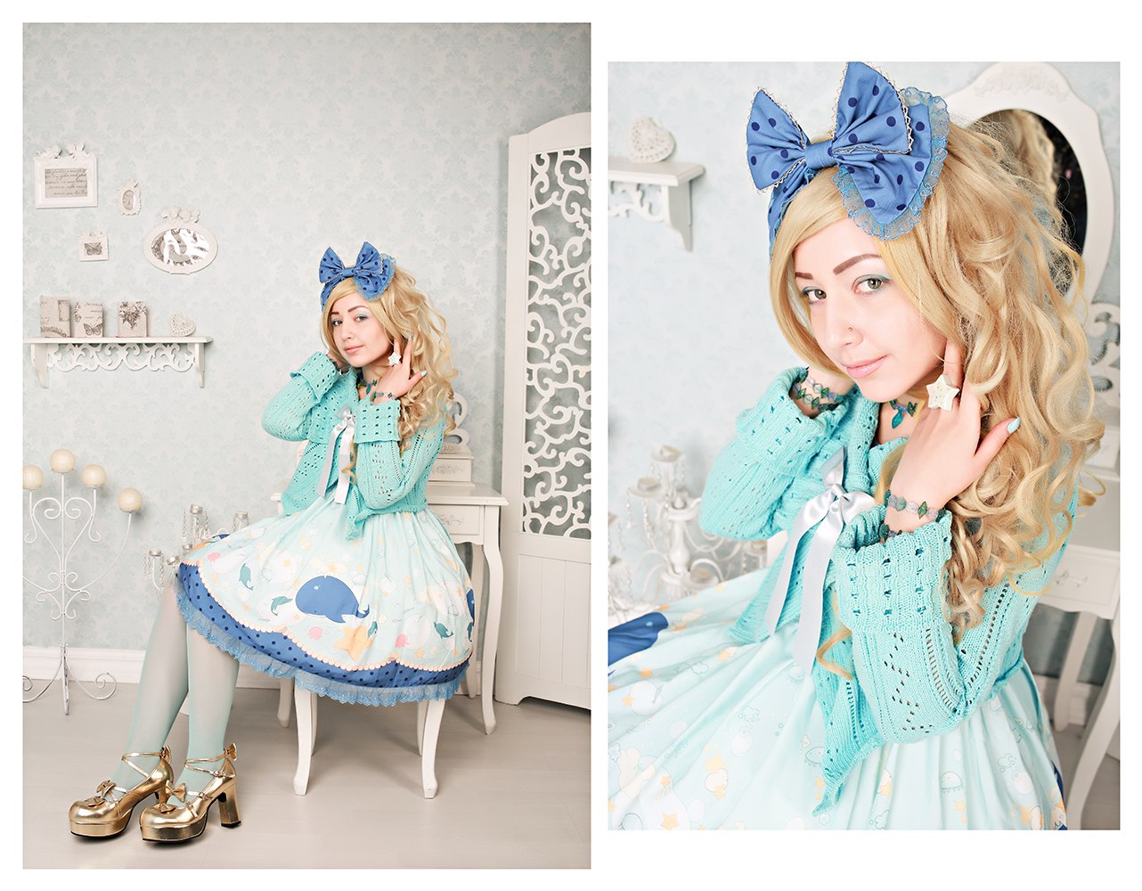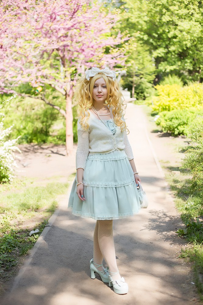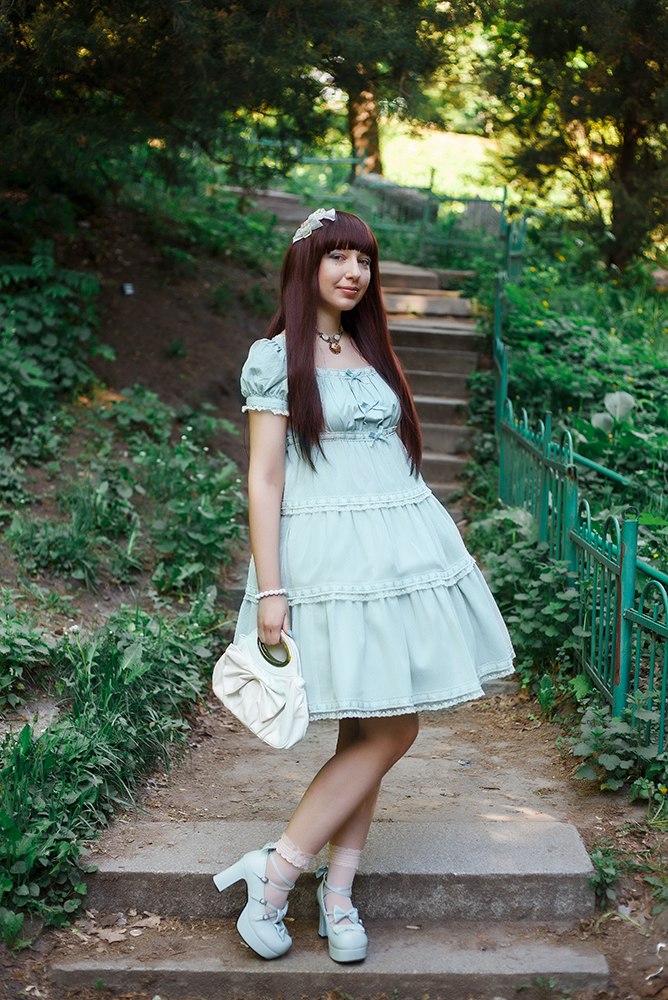 1) Парик - длинноват, и нужна челка. Но допустим, она изображает "русалочку", ок. 2) Мейк - слишком взрослый, и эти жуткие неестественные вытатуированные брови. Она видимо думала, что ей бонус пойнтов дадут тени в цвет платья, но нет. Смотрится по-шлюхански. 3) Бант-вертолет, очевидно снятый с платья. Лучше сделать или купить подходящий хеддресс. 4) Нужно подбирать не только в цвет, но и в стиль (это мне часто на ум приходит, когда я ее коорды вижу). Колечко в тему. А колье и браслетики похожи на украшения моей бабушки из 60-х. Конечно, не всякий может найти или сделать украшения на морскую тематику, но лучше взять что-то нейтральное, цепочки или жемчуг. 5) Колготки слишком прозрачные. Да, да, они мятного цвета, но не все, что мятного цвета, стоит пихать сюда. Это же относится и к кардигану. 6) Туфли - ну сириусли? ну неужели же не видно, что пиздец? они бы еще так-сяк смотрелись в отт классик коорде, где много золота, цветов, и кружева. Тут они слишком выделяются. 7) Платьице само по себе довольно простое, принт не очень детализированный. Может у меня предубеждение, но с ним в принципе только какой-то кежуал свит образ соберешь. 8) Я понимаю, что лицо человек себе при рождении не выбирает, но позировать и подбирать вещи для своего типажа можно и научиться. Выражение лица контрастирует с по-детски милым принтом. Ну не выглядит она милой маленькой лолиточкой. >>44400 Тут не только в цвете туфель дело. Такие массивные платформы - ну в олдскуле еще да, сошли бы, в готике, классике, но тут?