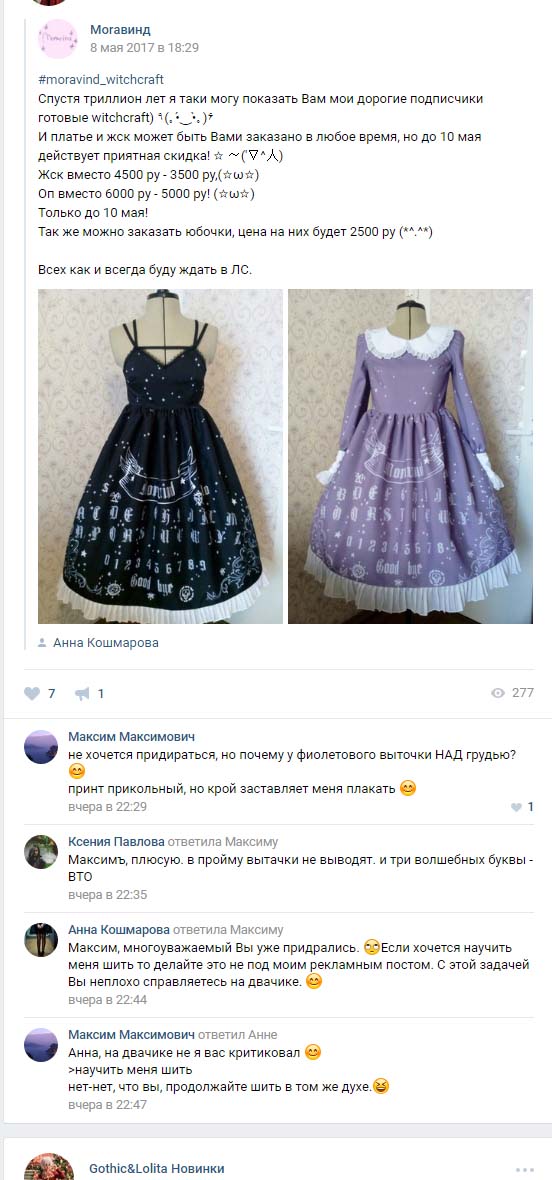 Вы хорошую тему подняли. Мне тоже интересно, у кого какое качество. У меня есть одна вещь от Моры и одна от Сна Софии, я люблю сравнивать, и тут просто небо и земля. Мора, учись строить лиф у платьев, он на всех фотографиях выглядит очень косым и как будто не на тулку человека шился( Вот качество у РэйвенЭндРоуз мне тоже интересно, хотя мне совсем не нравится дизайн.. А у Сна Софии я немножко запала на новый принт с витражами. Но я нищеброд сейчас, временно ничего вообще себе не позволяю.