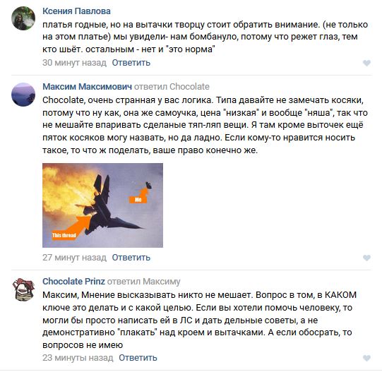 А если серьезно, то мне кажется, что это кто-то из швей или личных неприятелей моры вкидывает говна на вентилятор, настолько это тупо выглядит со стороны. У нее был показ-КОМПИЛЯЦИЯ, из нескольких коллекций, и каждое платье было представлено минимум двумя версиями. По сравнению с некоторыми, которые высирают по два платья на коллекцию, отличающихся только цветовым решением, это был полноценный показ. Что сука характерно, Орловых, которые сделали то же самое, только хуже (три криво пошитых совершенно разных платья), здесь ПОЧЕМУ-ТО никто не срет. Срут ПОЧЕМУ-ТО только Мору.
