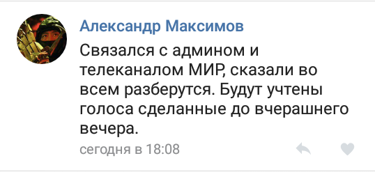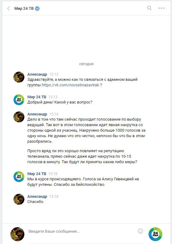 https://vk.com/wall-88687486_3671 Несу несу, видели? Телеканал МИР: "ДРУЗЬЯ! У ВАС ОСТАЛАСЬ ОДНА НЕДЕЛЯ, ЧТОБЫ ОТДАТЬ ГОЛОС ЗА ПОЛЮБИВШЕГОСЯ ПРЕТЕНДЕНТА НА РОЛЬ ВЕДУЩЕГО!!! " Вы же сделаете правильный выбор? Голосуйте за кого угодно, только не за Алису Гевенцвей