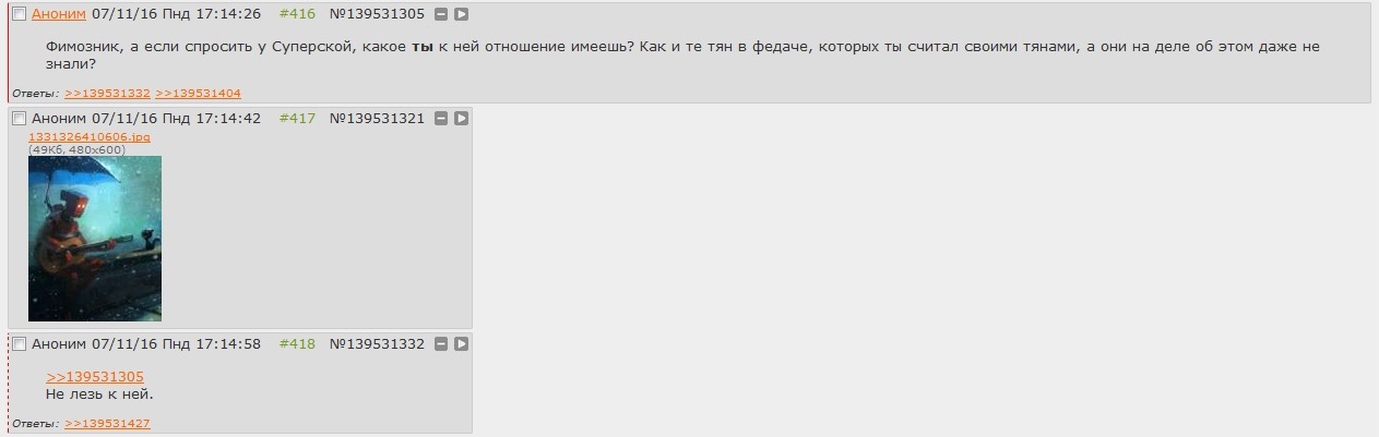 Этот тред боится меня. Я видела его истинное лицо, нити — продолжение сточных канав, а канавы заполнены япона стилем лолита. И когда стоки будут окончательно забиты, то вся эта мразь начнёт тонуть... Когда скопившаяся грязь отчаявшийся начинашек вспенится им до пояса, все Барашковы и Рязановы посмотрят вверх и возопят: "Спаси нас!", а я прошепчу: "Нет".