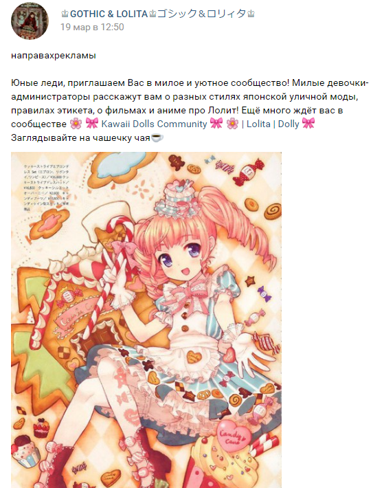 >>46885 Да какие лоликонщики, чур тебя. Обычная "няффная" группа, созданная школьницами для школьниц. Посмотри альбом с "лолитными фотосессиями" и сделай выводы о тамошней целевой аудитории. Туда не надо ходить вообще, незачем отбирать у детей их кукольный домик, где они мечтают быть принцессами.