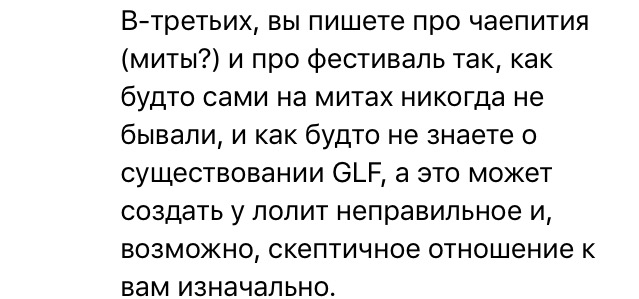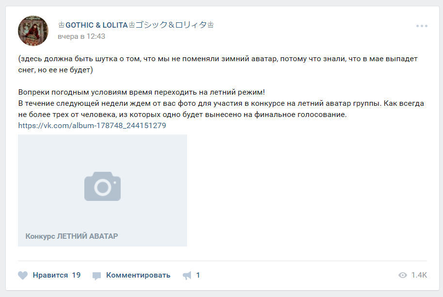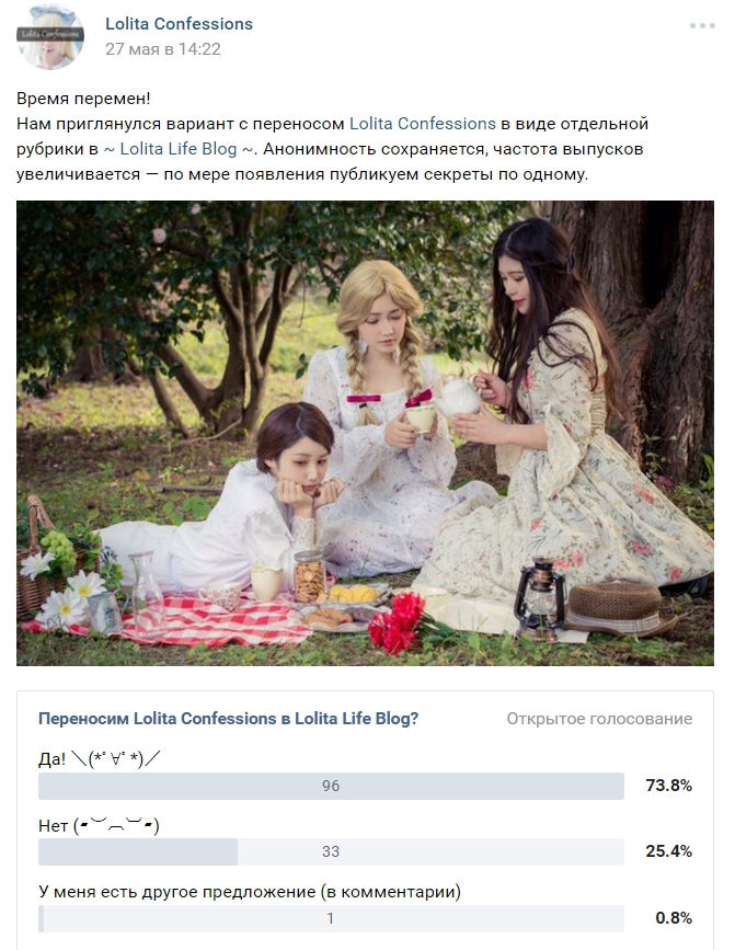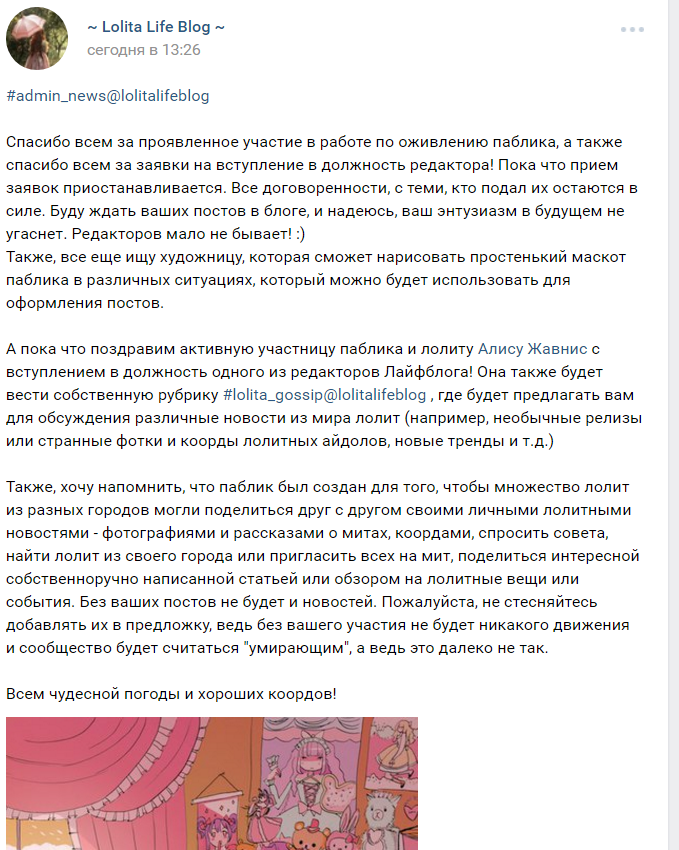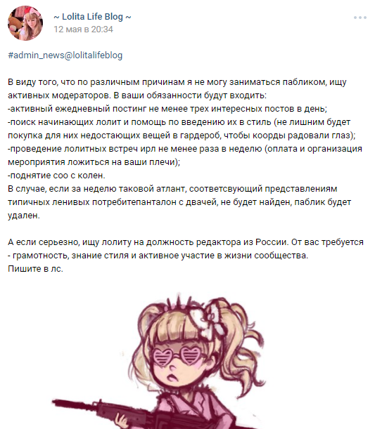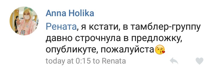 Ну вот не надо. Я несколько раз давала клич о наборе админов в тот же тумблерилолиту, когда поняла, что не могу заниматься сообществом так плотно, как могу, и что ты думаешь? Отписали две безграмотные школьницы, которые про лолиту знают три дня по анимекартинкам. Все. Тоже самое было с лайфблогом, уж сколько мы активничали, что только не придумывали - никакие идеи долго не работают. Челендж сдулся, темы месяца тоже. Никто не хочет писать, даже фотки впадлу сбросить, даже старые сеты вспомнить, все хотят только смотреть, ну иногда еще царский лойс ставить, если достойны. Думаешь, я нашла художницу для оформления группы, чтобы сделать маскота? Никто не написал. Никто. Когда я писала рисующим тян, все ка кодна написали - ой збс идея, ток я ща занята, обязательно нарисую! Нарисовали? Нет. Никто не хочет ничего делать. Даже если я лично буду постить каждый день, то это ничего не изменит. Сколько было голосований, сколько было вот этого всего... В итоге никто все равно не постит и сами ничего не предлагают. Что касается митов - я публикую 99% предложки. Если мит предлагают - я его пощу. Но я хохол, я не могу российские миты отслеживать сама, так как я не заинтересована в этом. Если вдруг вижу, конечно, где движуха идет или патичка, то делаю репост и без напоминания с другой стороны. Но админы митов сами обычно не рекламятся. Я бы с радостью взяла в админку кого-то из России еще. Марго вот есть, но она ради увядшего челенджа художников (который можно было бы продолжить, но всем пофиг). Но мне никто вообще ни разу не писал - эй, хочу оживить в группу, я знаю что делать, возьмите в админку! Нет, будем писать на дваче - пафосные админы не хотят терять статус, все пропало, шеф! Какой, к херам, статус? О чем вы вообще? Хотите, чтобы было активно - пишите мне в личку, в группу, предлагайте свои идеи, проситесь в админку и никто вас ссаными тряпками не погонит (ну если, вы, канеш, не вахтанг))00). Предпримите какие-то шаги сами не только на анонимном форуме, и вот потом ,если получите отказ - пишите про зажравшихся админов, который трясутся над мнимым статусом. Просто панталоны вот сейчас прожгла от этого обсуждения. Горько от этого всего. Потому что в свое время без моего участия практически загнулась вся киевская движуха. Не потому что я пафосная задушила все. А потому что я перестала делать - и никто не пришел на замену. Никто не поднял с колен мертвое соо. По одной простой причине - всем лень поднять жопу, всем на самом деле похер. Есть - ок, нет - ну и хер с ним. Вот и весь секрет Полишинеля.