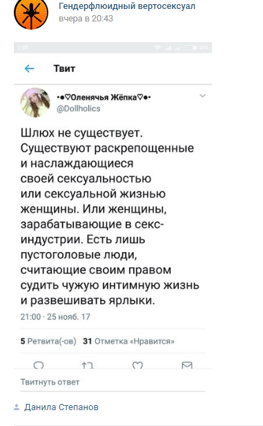 Алсо, шлюх не существует, но некоторые категории баб самими бабами типируются, как шлюхи? Что, блядь. Если настаиваешь на чем-то, то настаивай для приличия подольше, разница между этим и твитом, который обсуждается, несколько дней буквально.