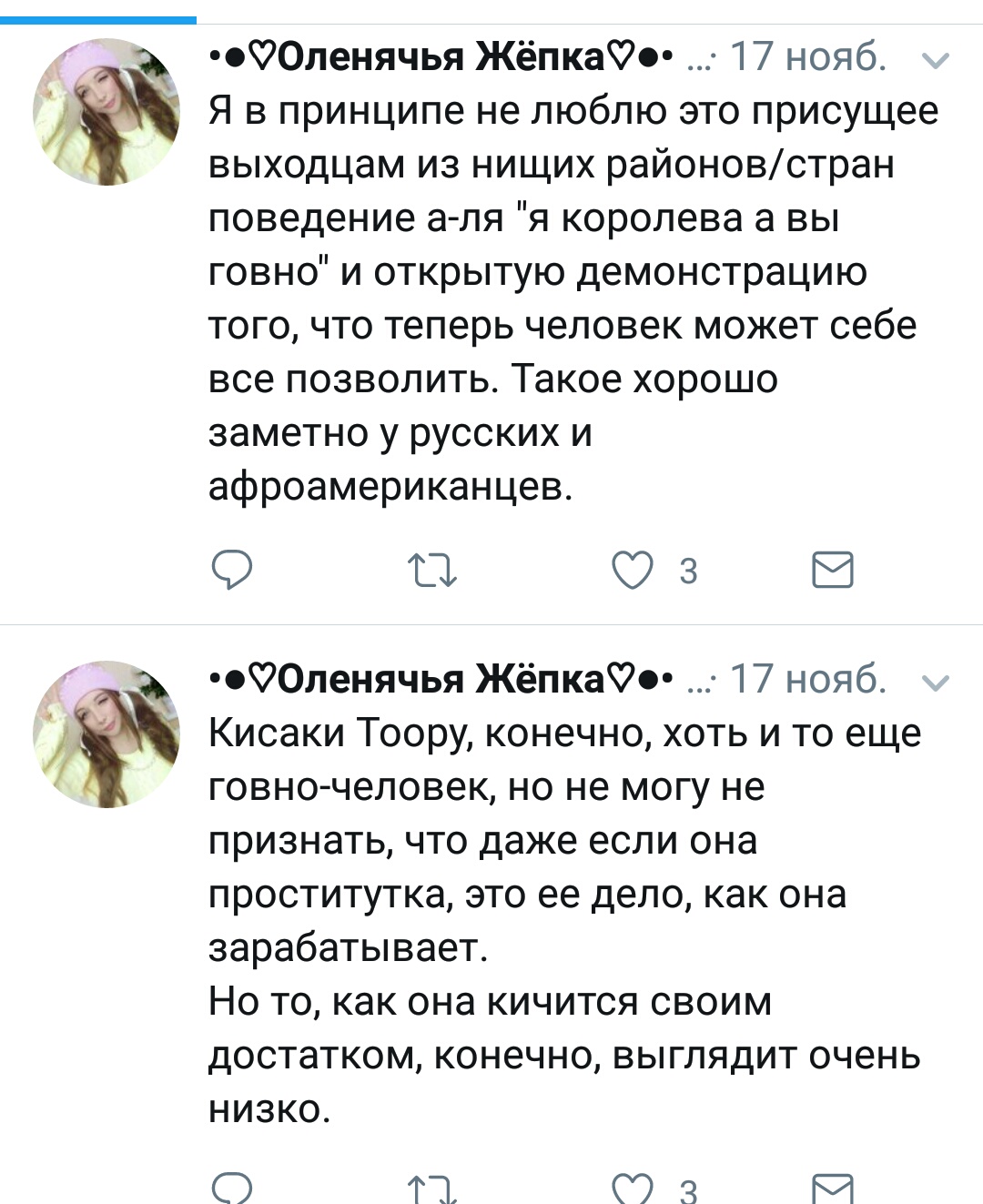 И нет, ты не сделала это "один раз, потому что злилась", ты об этом несколько раз писала и на аске, и в твиттере, не забывая упомянуть, "я не расистка и не лукистка, но японки такие страшные, вот то ли дело европейки...". Нет, вафелька, ты именно что расистка, лукистка и просто тупая лицемерная пизда.