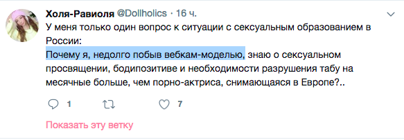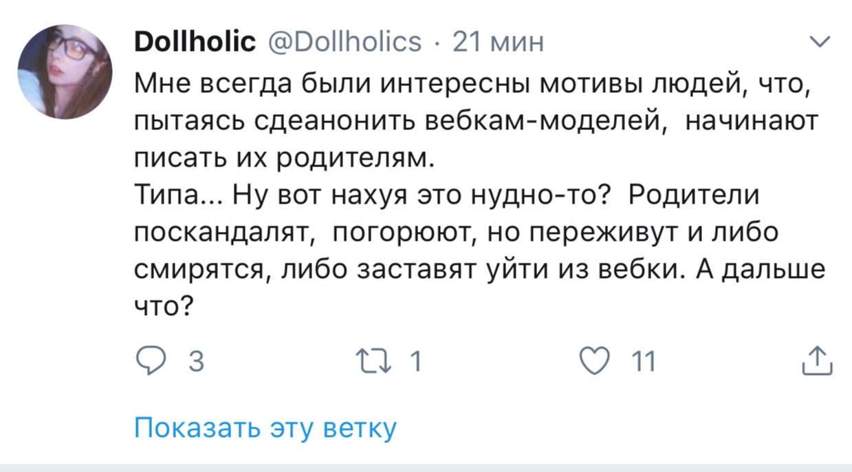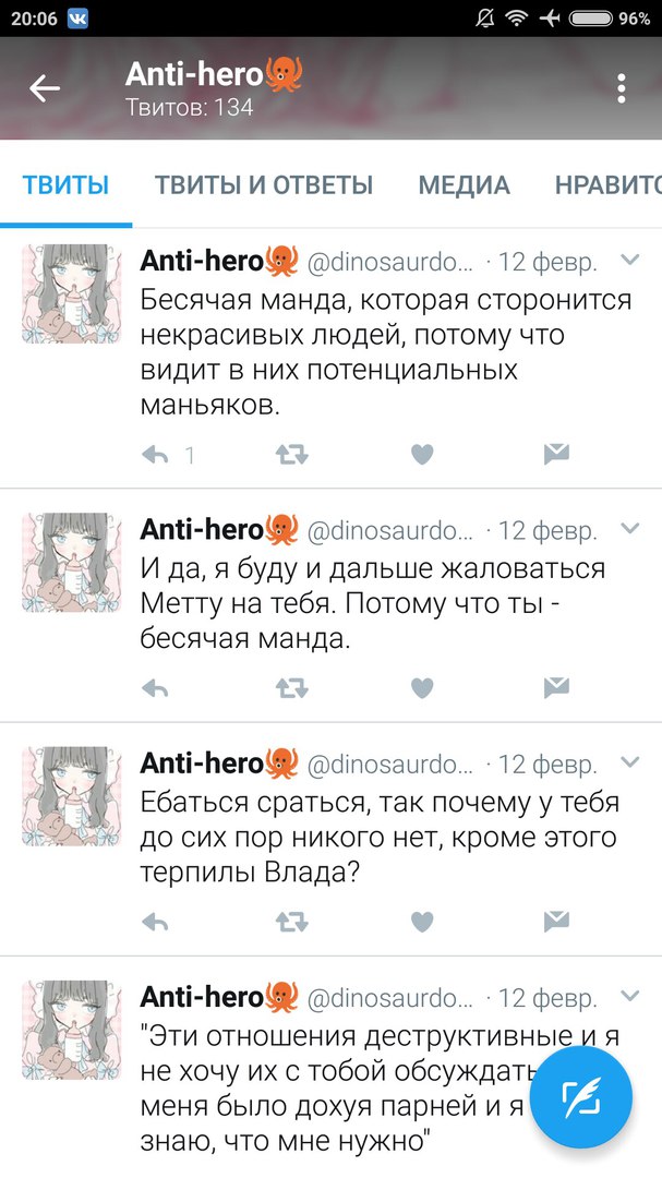 Веселит как вафля постоянно истерит когда кто-то приходит к ней в реплаи со своим мнением, но сама всё лезет к другим людям которые так же как и она высказываются у себя в твиттере. Причём настойчиво так лезет, будто удавила бы любого кто имеет другую точку зрения...