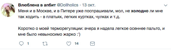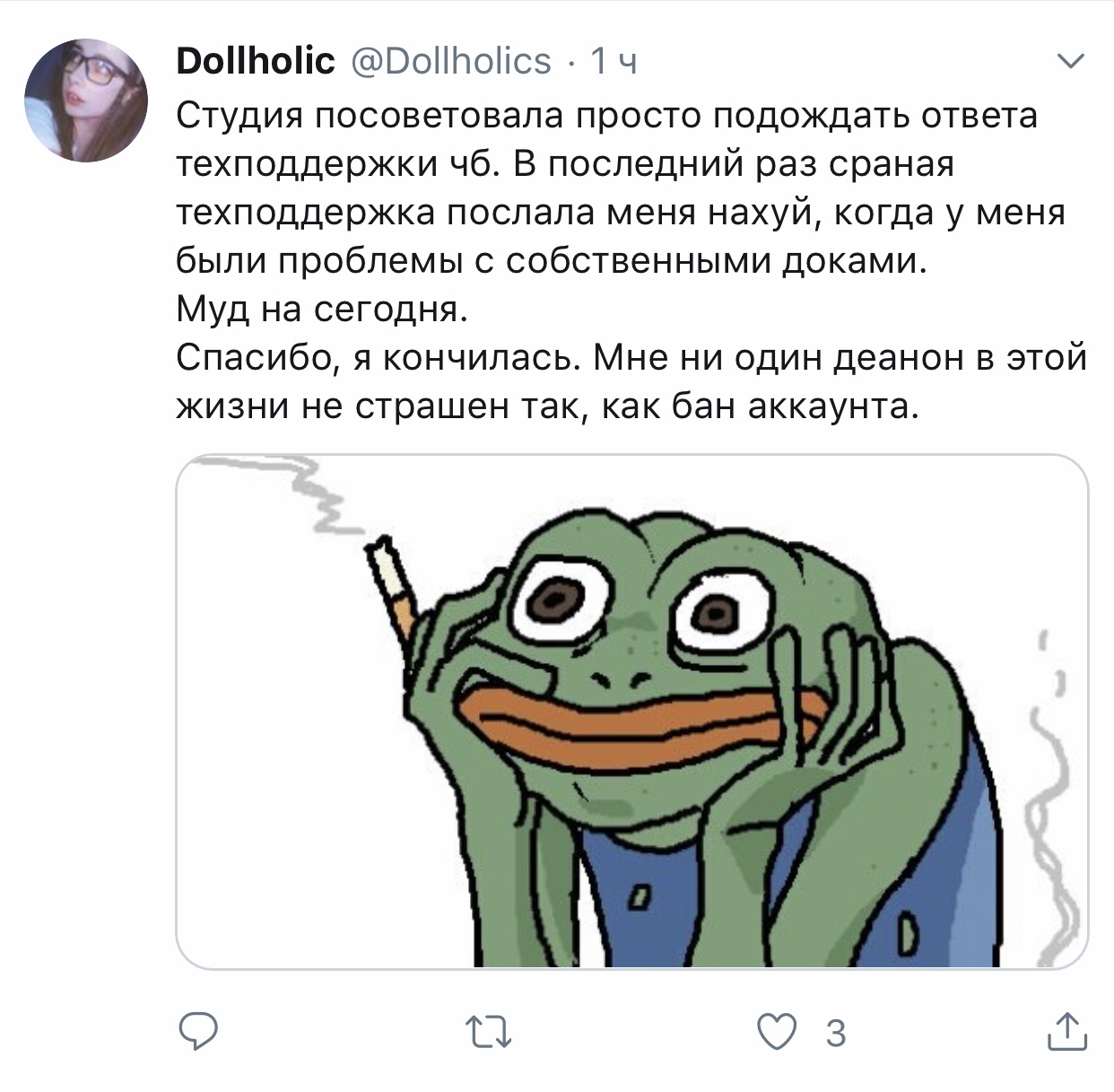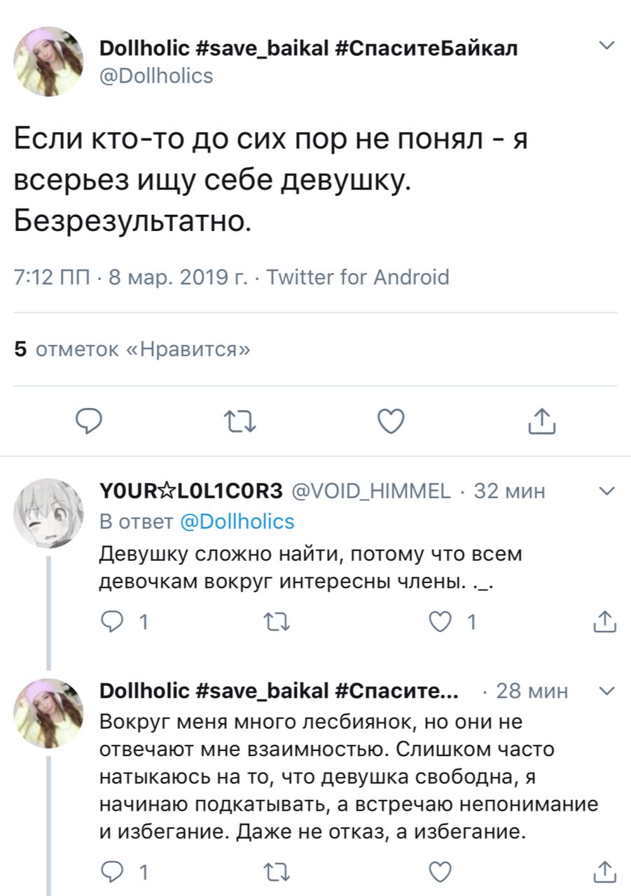 God bless you, 2ch. Помню, благодаря Холик где-то в 2013 году узнала о Lolita. И вспомнила её имя только сейчас, спустя годы, решила проверить её твиттер и просто в край охуела. Она кричит о том, какая она милашечка и мирная, добавляя что 'не начинает споры, а заканчивает' и спустя пару твитов она влезает в чужой разговор и оскорбляет человека как полнейшая ебланка. Только и делает, что ноет и ноет на страну, при этом ничего не делала. Прочитала весь трэд, и не понимаю, как её друзьям не страшно с ней находится, тем более тому гею, с нею-то жить. Пиздец. Не удивлюсь, если она его под дуплом держит.