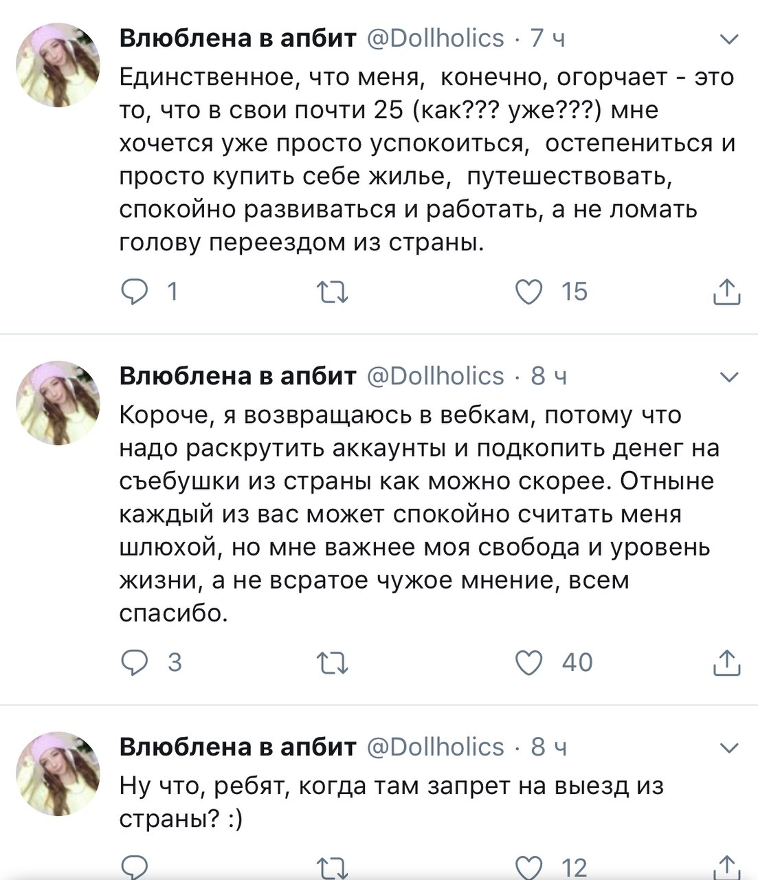 Меня беспокоит то, что она не знает, какие в Скандинавии налоги, я из-за цен и налогов от Норвегии дважды отказалась, а она так легко об этом пишет. Неужели она верит, что веб-кам её прокормит? Она ленивая для регулярного заработка на платформах. Или думает, что в этих странах она сможет спокойно и легально в секс-индустрии работать? Нет. В постсоветских странах, где дешёвую "русскую" порнуху снимают нашли недо-таланты, может быть. Самый максимум Венгрия.