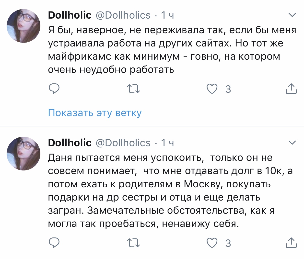 12 часов на 7 дней = 84 часа. Предположим, что пиздеж и сократим до условных 70. 300 баксов. Примерно 19-20к рублей (хз какой там курс точно). Допустим, 20.000 Итого, в час чуть меньше чем 300 рублей. Мне кажется, или даже в макдаке з/п выше? Я так мало даже в первые дни на вебке не зарабатывала, а она вроде как уже пару лет сидит. Плюс у неё ещё и студия, что блять пиздец какой зашквар. мимовебкамшлюха