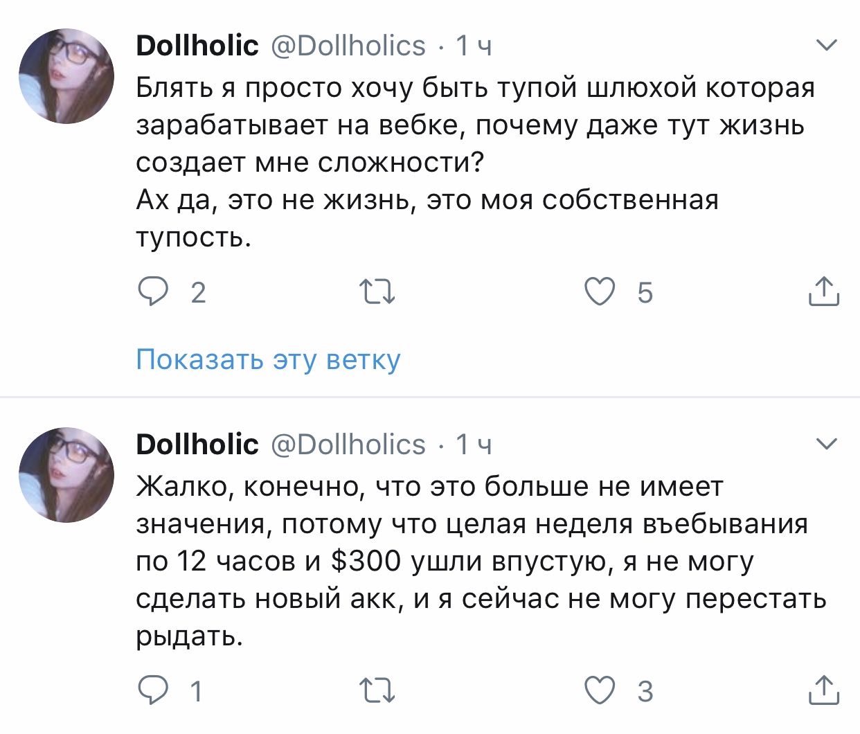 Мне ее жалко,она как будто совсем дурочка,может и недоразвитая психически и интеллектуально.Такую дичь пишет,радуется копейкам от какого-то дрочуна.Какая у человека жизнь должна быть,чтоб он мечтал стать проституткой и воспринимал онанистов,как влюбленных в нее мужчин.Ей бы вернуться к родителям и пойти к психотерапевту,а не жить за счет гея-путаны и пытаться вписаться в компанию киберпроституток. Человек не приспособлен к работе и взрослой жизни в принципе((