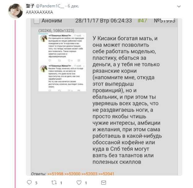 Не догоняю, чего вы ее застираете? Из всех, кто называл себя гяру, она самая нормальная же. Никого не обманывала, бложила по-тиху, спортсменка, комсомолка и просто красавица. Конечно, смешно было смотреть, как она пыталась продвигать стиль ко-гал со своим ангельским контентом. Было бы куда правдоподобнее, если бы: привет, битчс, я вчера на вписке зависала с тремя парнями… и тупо ржот на камеру. Ну, ворвалась однажды на двачи, бывает, человек просто впервые попал в эту помойку, и что? Где там ЧСВ я не поняла? Девочка как девочка.