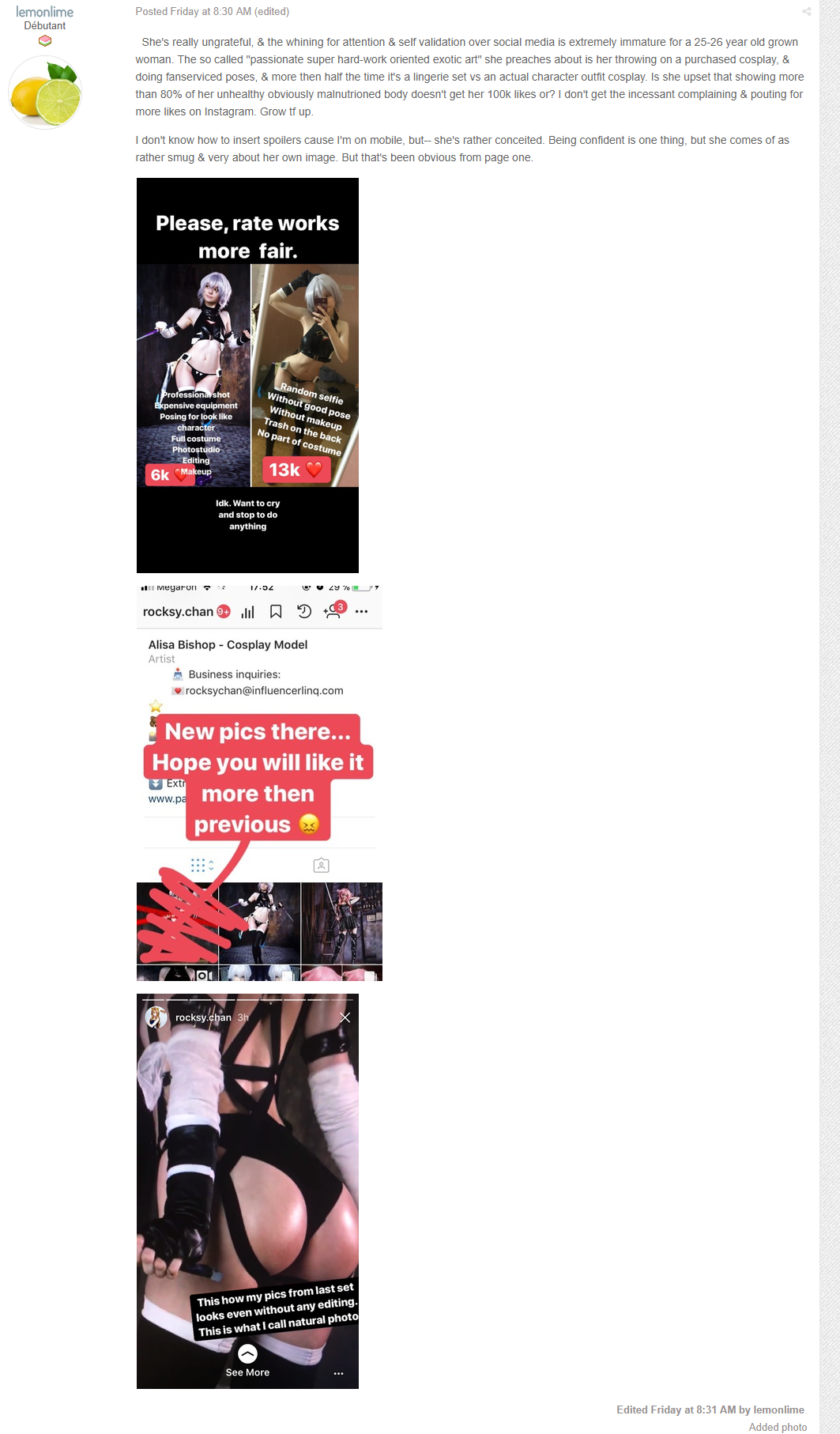 Дрочеры не поймут. У каждого в школе есть/была училка, которая любит пацанов и ненавидит девочек. Это как раз Бишоп. Все бабы у нее соперницы. У нее нет подруг ирл. Все люди, с которыми она общается это известные инстаграмерши другого типажа фигуры обязательно от которых у нее совместные ПРОЭКТЫ. Если Алиса снимет фотосессию/селфи с другой лолей, она обязательно ее хуже отфотошопит читай треды. Ирл друзей она бездоказательно мешает с говном, у нее их просто нет)0 Даже подписи в инстаграмике и твитере она строчит для хуев или средних полов.