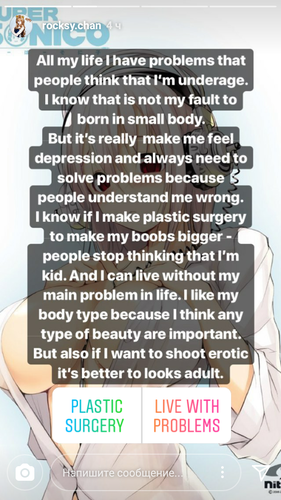 >>52484 Да щас, мне кажется она просто хочет, чтобы ее пожалели/начали отговаривать. Она не настолько тупая, чтобы не знать, что она делает деньги с любителей лолей, зачем ей отгонять аудиторию? Ну или как подметили выше, она это делает не потому, что малолеткой называют, а потому что обвисла.