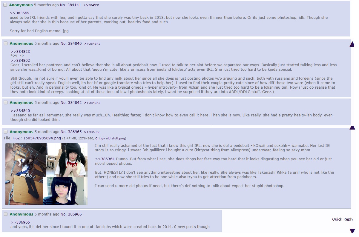 Привет, Алиса, непочитай :) Я думала что я одна такая русская принцесса сижу на лолкау, но вот наткнулась на твоего "инсайдера" в местном тредике. Судя по ебучему еджи-сленгу, это юкагуу >>52314. Прими меры, начни на нее в сториз жаловаться и публично хейтить, как ты это любишь, она заслужила.
