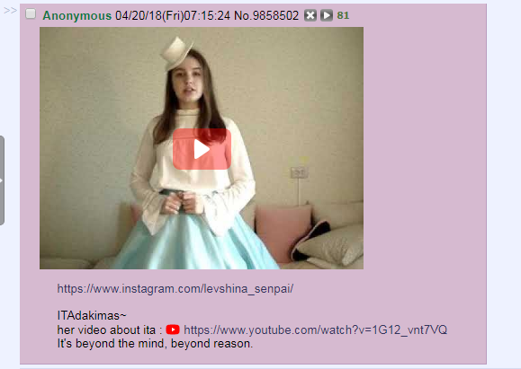 >>53256 Девочка милая, но смешная. Сперва я тоже хотела возбурлить, что всего-то научилась шить юбку солнышко, как уже пытается давать советы по стилю. Потом поняла, что, скорее всего, она копирует идеи для видео у более опытных лолит-влогеров. Вряд ли она считает себя охуенным экспертом. Скорее всего, она не знает, о чем еще рассказать. Шансы вырасти во что-то приличное у нее есть. Судя по инстачу, у нее кто-то из родственников визажист и парикмахер, а она сама довольно милая на внешность. Но вероятность того, что, как только она выйдет в большие воды, ее тут же загрызут за попытки учить людей стилю, стоя перед камерой в маминых лодочках, картонном минихэте на прямые волосы и юбке-солнце поверх ебучего кринолина, тоже очень высока.