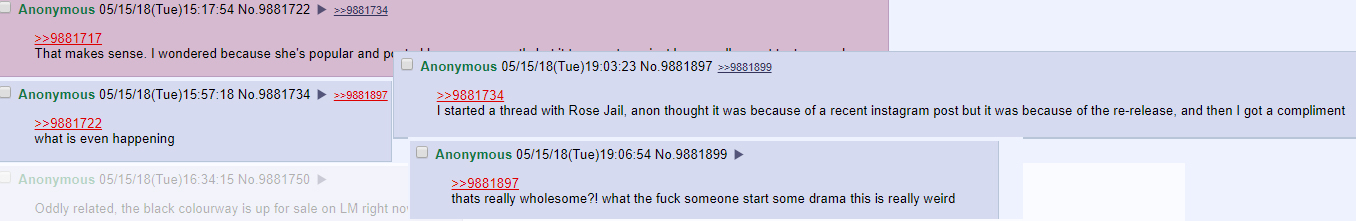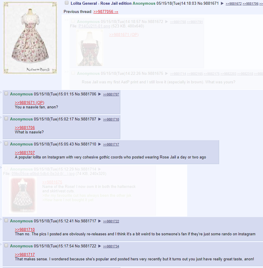 Дело не в сравнении шмота с Китая и шмота брендованного, это сотню раз уже перетирали. Проблема в ценниках. Почему на б/у вещь цена такая же, как на новую? Сейчас кто-то еще гоняется за супер редкими выпусками, что готовы закрыть глаза на поношенность и отвалить крупненькую сумму "ну это же то самое, пох что в чужих пятнах пота и с порванным кружевом, главное, что это оно!" В секонд хэндах ценник сбрасывают, это нормальная практика, но нет, в лолитных вторичках видишь зачастую наоборот накрутку. Да, потом человек разочаровывается, и начинает скидывать цену, но захочется ли вам брать платье, которое условно каждую неделю выкладывают все дешевле и дешевле? Логичнее сразу поставить адекватный ценник, а не ломаться как на рынке.