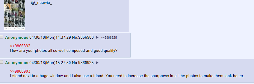 >>53805 да как она соберет что-то приличное, если у нее только платья и подъюбник? коорд - это не просто красивое платье, это очень много деталей, гольфы, обувь, аксессуары. впрочем, чего это я. мои первые образы были еще хуже. и пусть носит что хочет, но почему она это постоянно в соо выкладывает? подкиньте ей идею инстаграм завести и там это все выкладывать, господибожемой, если ей так внимания хочется.