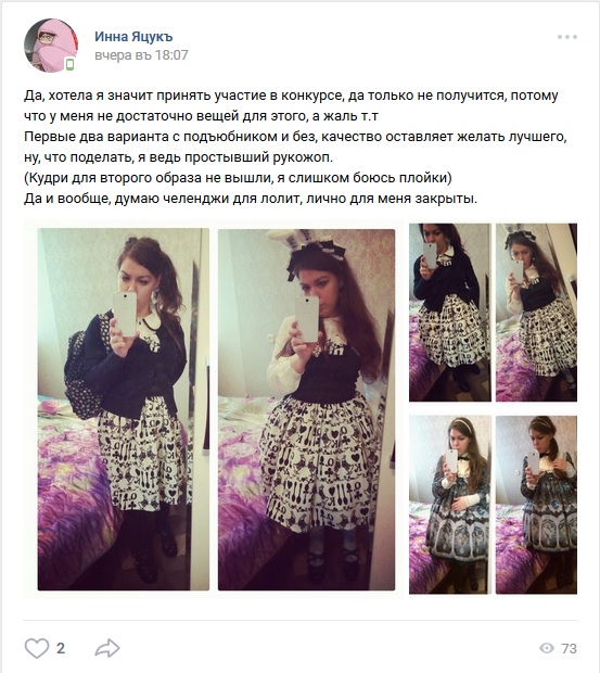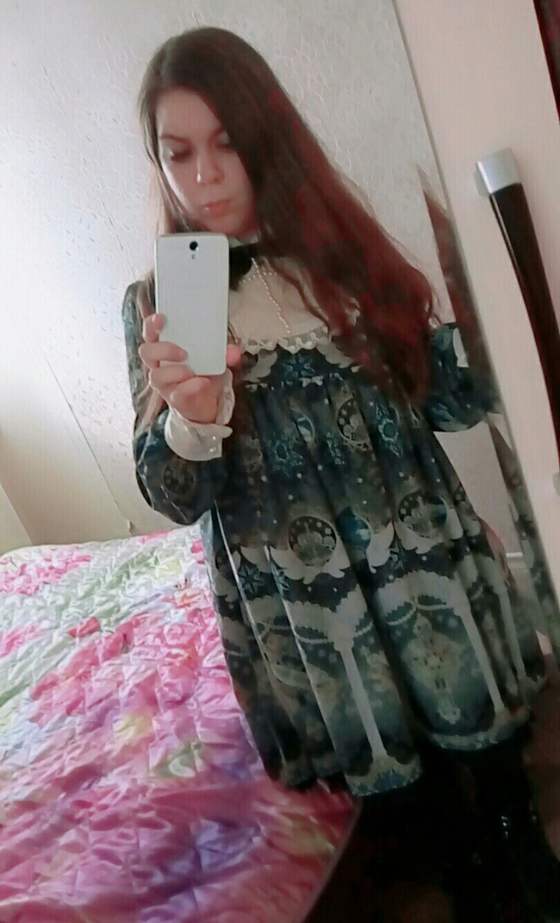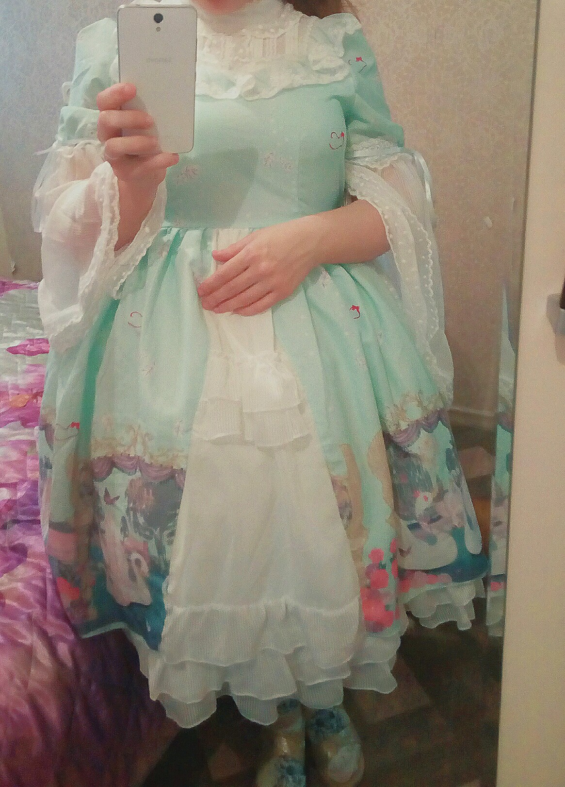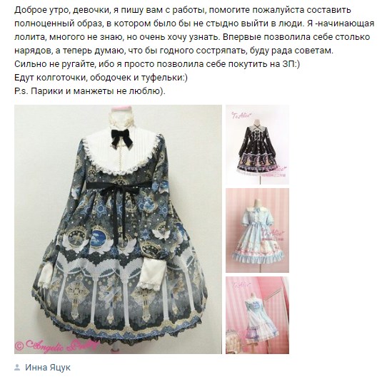 Дитя то милое, но история мутная: увидела лолит на фестивале, а в интернете забыла посмотреть что ли? Понадшила себе всякого барахла же. Хотя опять же про ГЛБ вспоминает, там не могла нормальные выкройки посмотреть что ли?