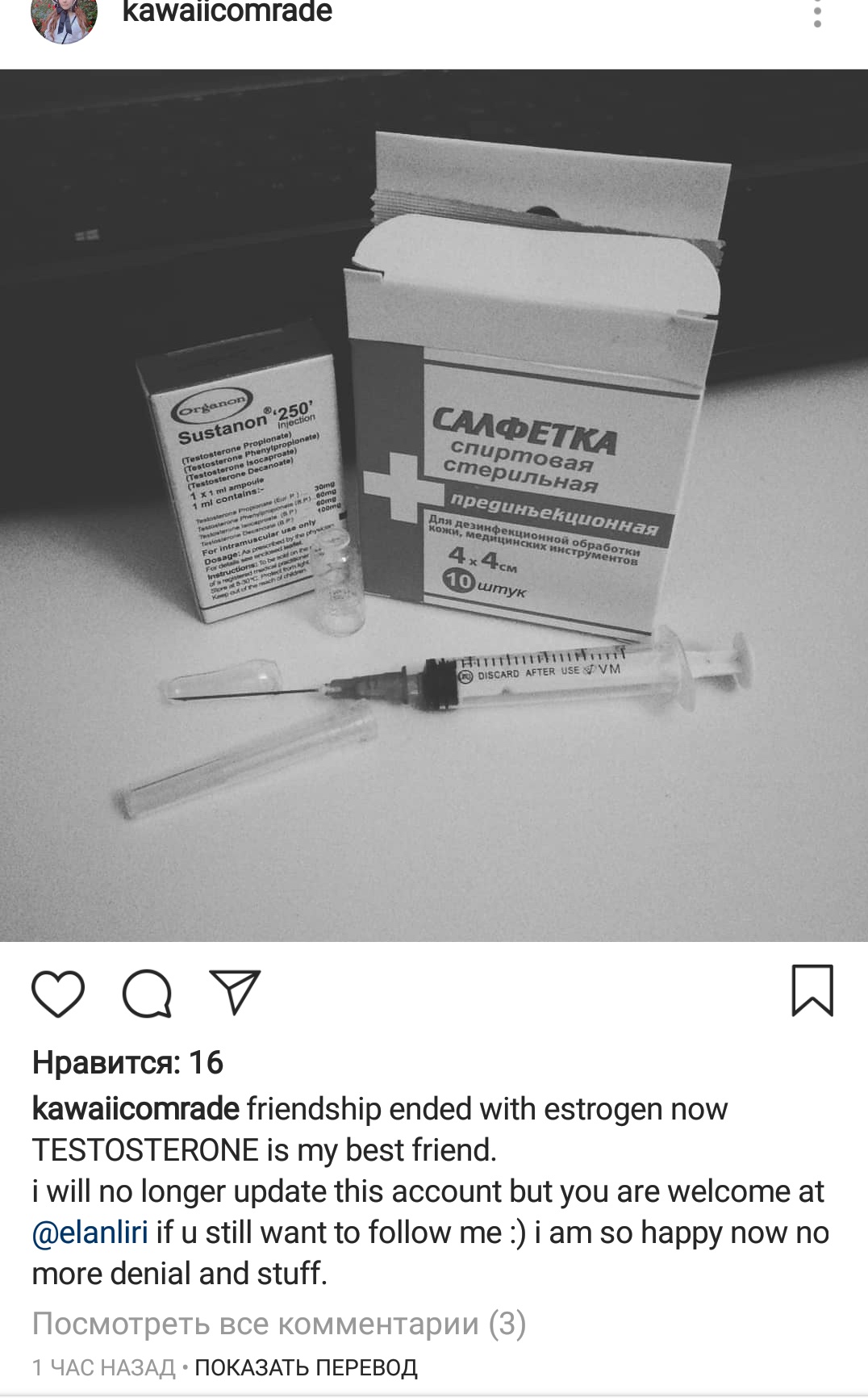 >>55891 Просто вниманиеблядь, которая не видит берегов в попытке получить популярность. То суицид, то гормоны. Очень сомневаюсь, что ей их назначил врач и она прошла специальную комиссию как желающий сменить пол.