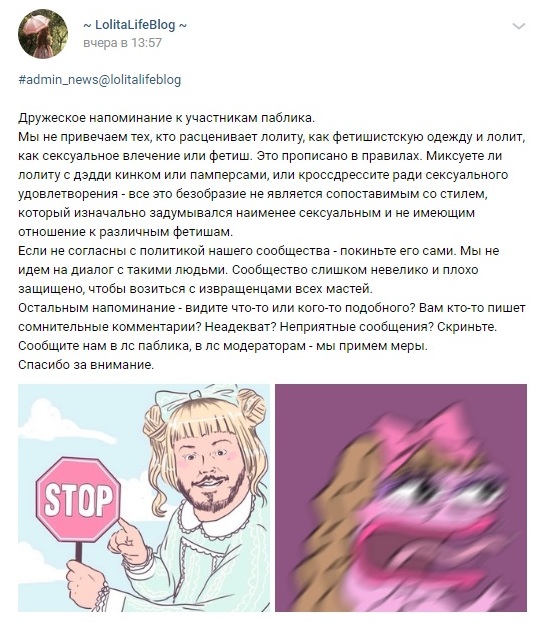 Главное соо умерло и навсегда осталось историей, которую мы будем рассказывать нашим внучкам, в очередной раз причитая, что притти и бэйби уже совсем не те, что раньше. Неужели та же трагическая судьба ждёт и лолитач? Неужели теперь станет нормальным, что проклятые говнари сначала запрещают своим жёнам носить лолиту, а потом яро защищают их право носить чёртовы реплики? И мы так и не увидим живых мужиков в нашем соо лесбух? И никто больше не пояснит нам за отоме и прочие сорта детских платьев? А вдруг больше никто не поможет нам придумать идеальное дефиле для лолитного утренника в засратном дк? И бирке-тян больше негде будет хвастаться футболками от гучи за 5к и анькой дембельбейстер? Отныне охуевшие ньюфажины сами будут нарекать себя богиньками? И как теперь прикажете выбирать пуховик на зиму?