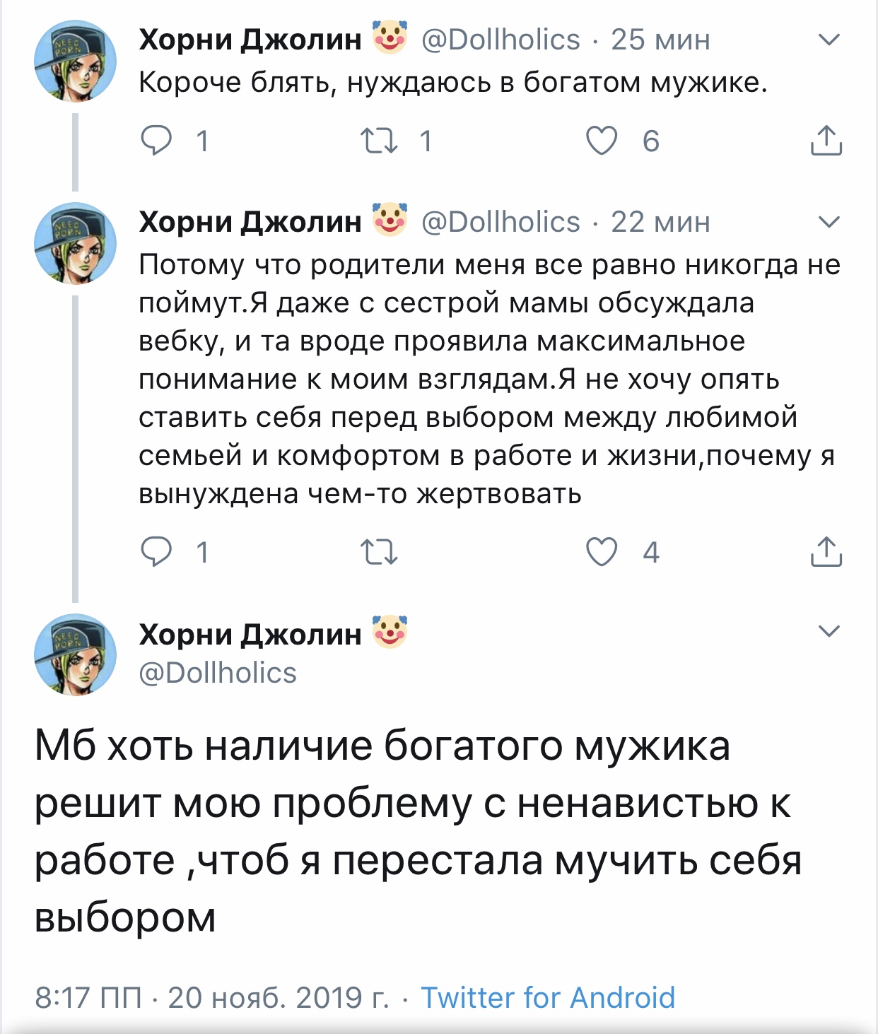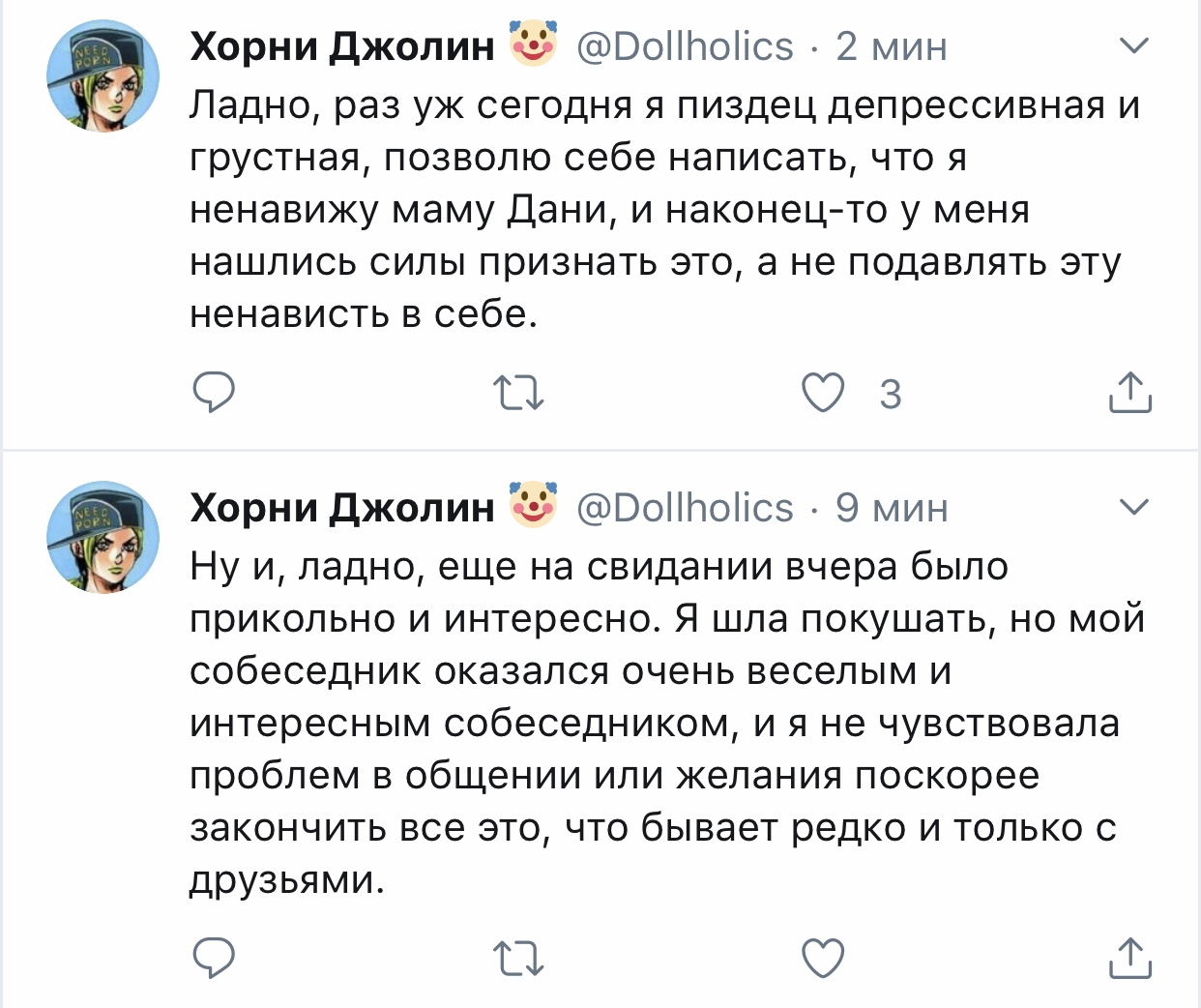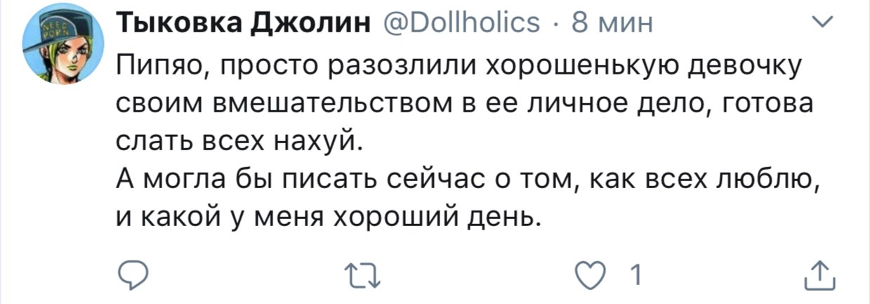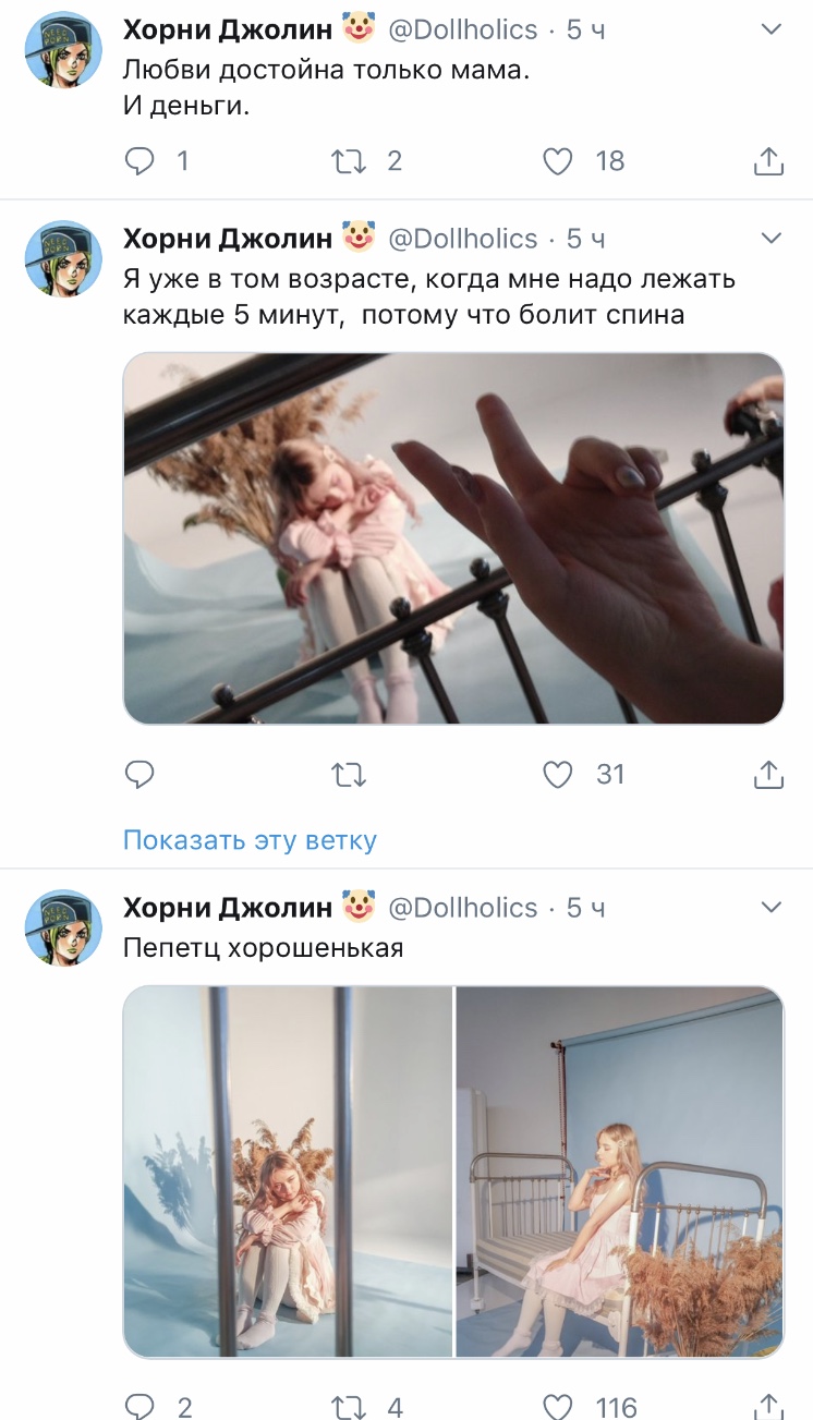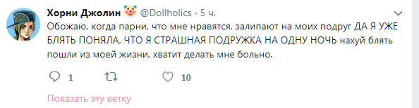 Хорни Джолин @Dollholics · 5 мин Наверное, пора опять уйти из интернетов... Хорни Джолин @Dollholics · 6 мин Хочу почитать ваши истории и ли мечты о прекрасном будущем, потому что у себя я его точно не вижу.