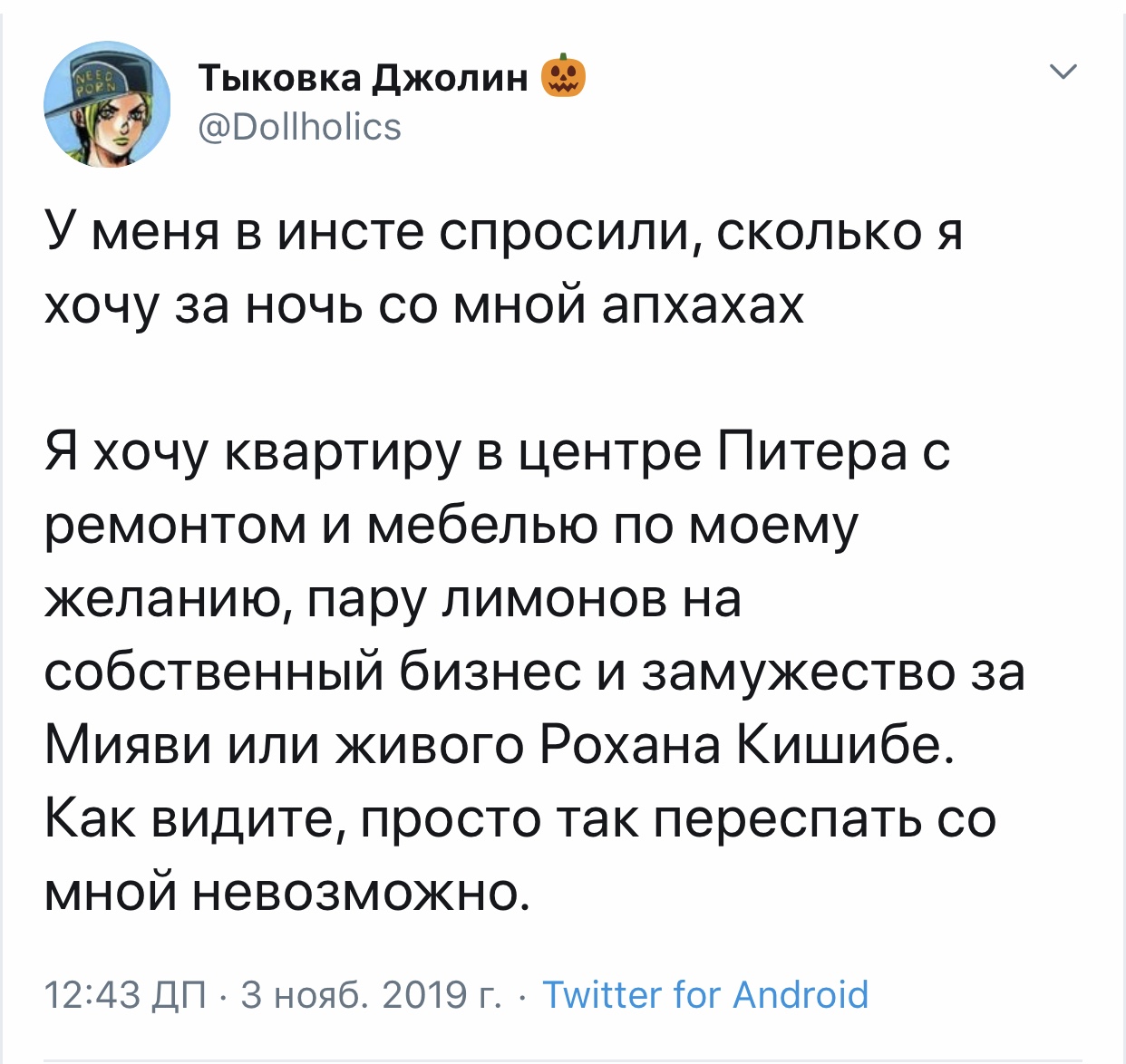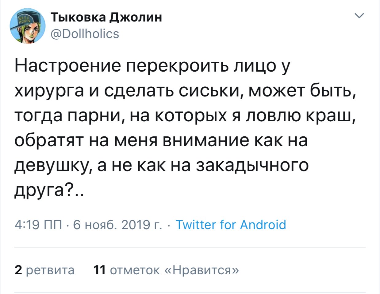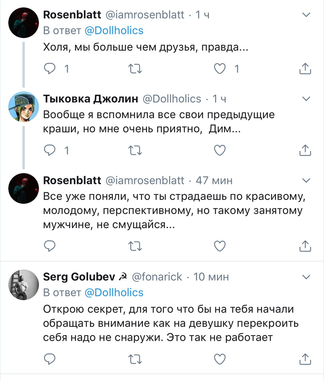 Хорни Джолин @Dollholics · 5 мин Наверное, пора опять уйти из интернетов... Хорни Джолин @Dollholics · 6 мин Хочу почитать ваши истории и ли мечты о прекрасном будущем, потому что у себя я его точно не вижу.