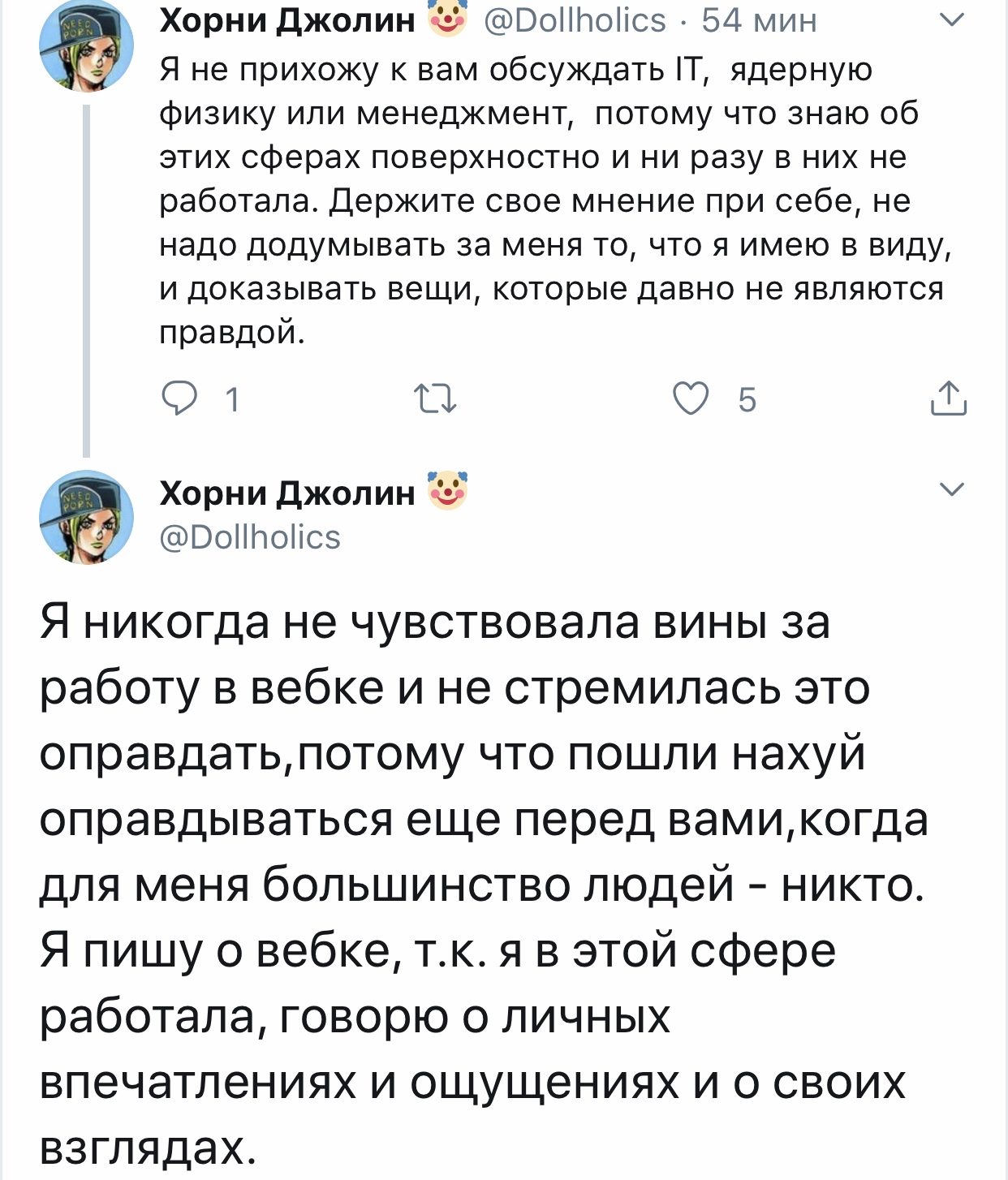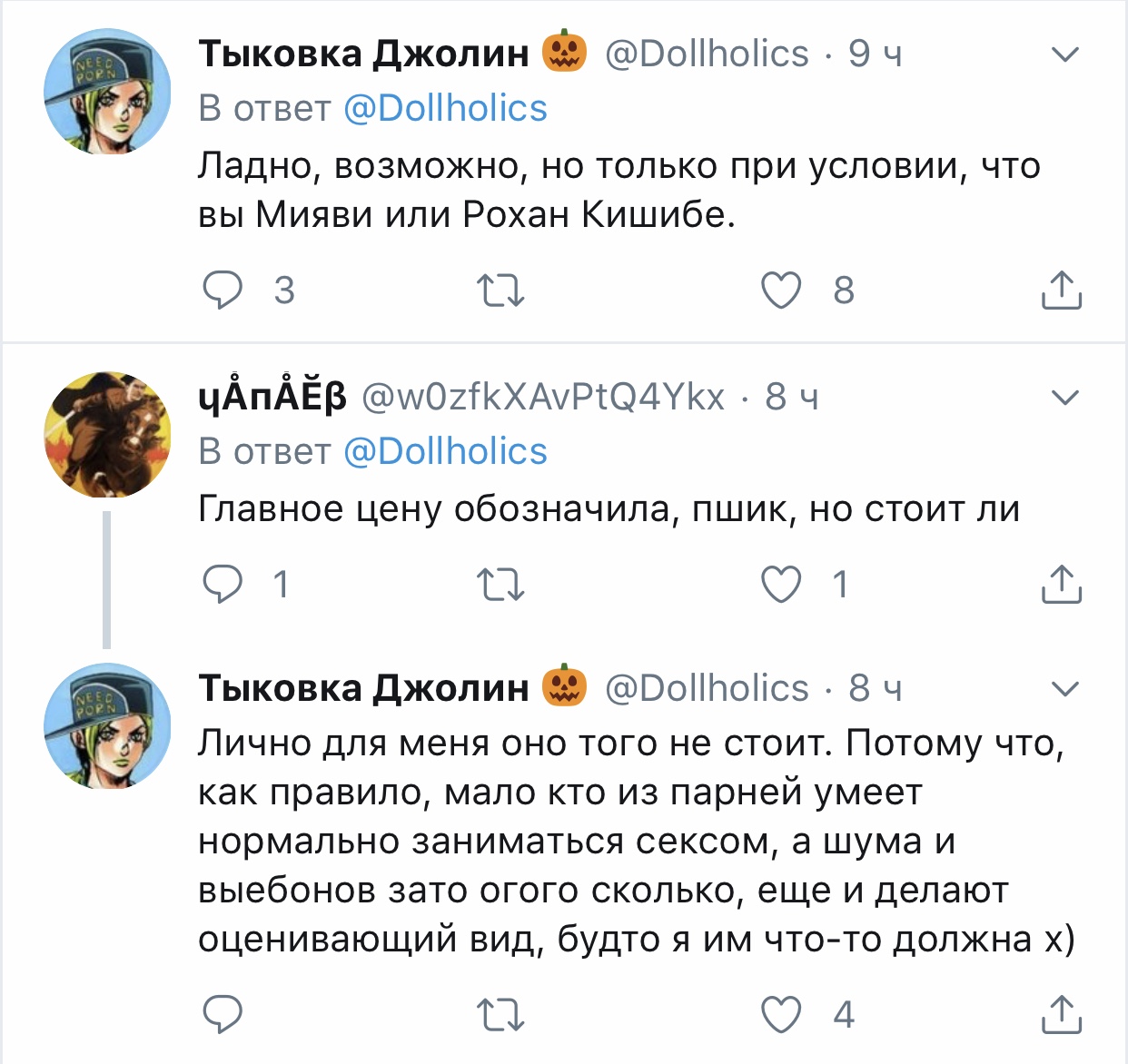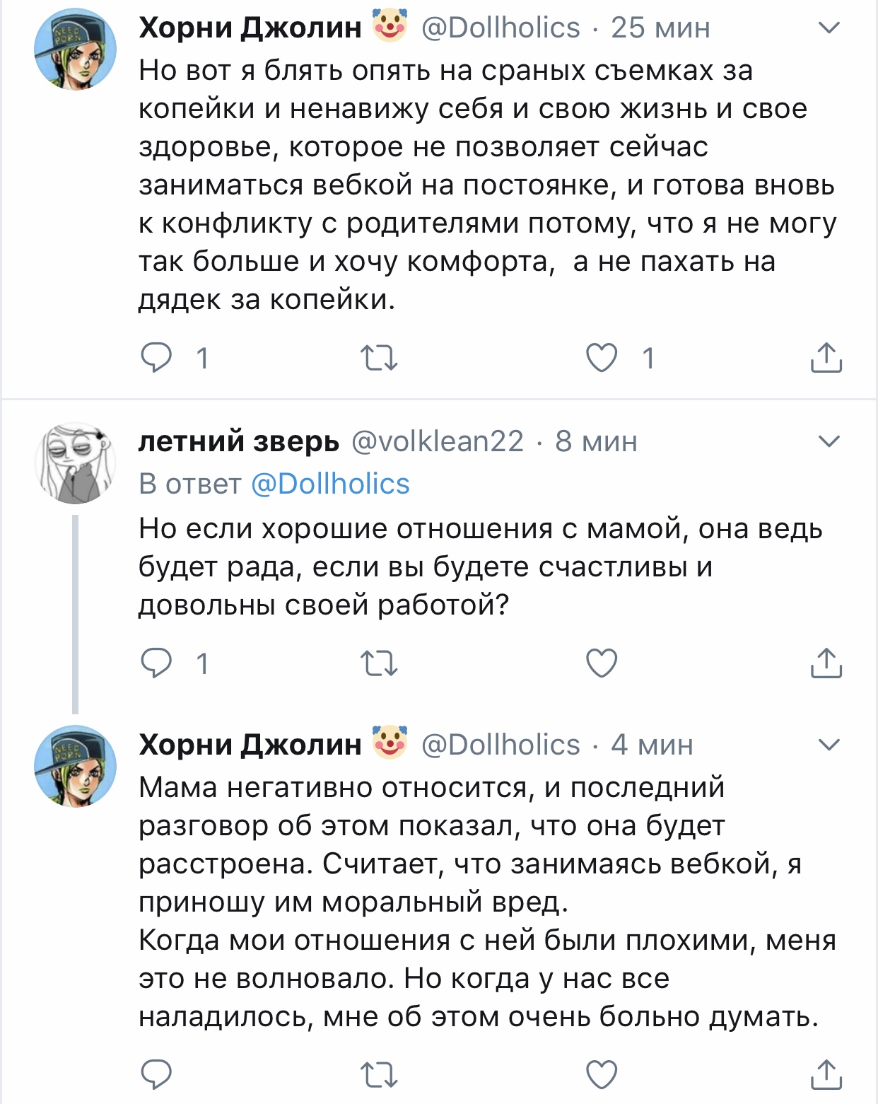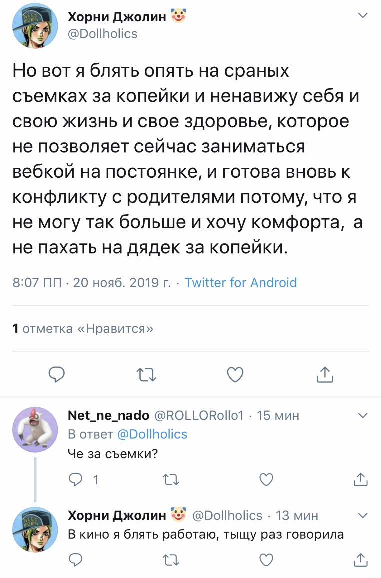 Переписка ᴍᴏᴏɴ ᴘʀɪɴᴄᴇss @aid_winter 10 июл. Сижу охуеваю. Я видимо никогда не пойму людей, которые деанонят вебкам моделей и сливают в соцсети всю инфу о них. Просто нахуя? Вам сука заняться нечем? Сходите лучше потратьте свое свободное время на благотворительность и помощь нуждающимся блять. Моралисты ебаные. Тыковка Джолин @Dollholics В ответ @aid_winter Весь мир: убивают и насилуют детей, снимают детское порно, убивают, расчленяют животных и постят это, аферисты разводят стариков на огромные суммы Двачеры: Вебкам-модель: живет.дышит.работает,никого не трогая Двачеры: ДЕАНОН, ПОСТИНГ ПРИВАТНОЙ ИНФОРМАЦИИ, РАССЫЛКА ДРУЗЬЯМ Hey, Nana @KreoniUA · 10 июл. В ответ @Dollholics и @aid_winter И они реально не понимают, что при этом палятся о том, что сами сидят на таких сайтах и наяривают. Тыковка Джолин @Dollholics · 10 июл. Га самом деле, насколько знаю, на двачах есть отдельно взятые люди, что преследуют живодеров и педофилов, но масштаб по сравнению с тем, как травят девушек, куда меньше. Если уж так хочется "справедливости" - в мире полно серьезных проблем и без секс-работниц. Hey, Nana @KreoniUA · 10 июл. Да я б даже не сказала, что это секс-работницы. Нужно подумать на определением Но в сфере интимных услуг реально хватает проблем, когда работницы страдают от своей "крыши". Лучше бы над этим работали, раз уж так им хочется о письках писать и раскрывать. Тыковка Джолин @Dollholics · 10 июл. Вебкам является сферой секс-индустрии, а вебкам-модели относятся к секс-работницам. Hey, Nana @KreoniUA · 10 июл. Да, понимаю. Это просто мои, так сказать, внутренние ощущения об этой профессии. В силу того, что отсутствует реальный контакт с реципиентом.