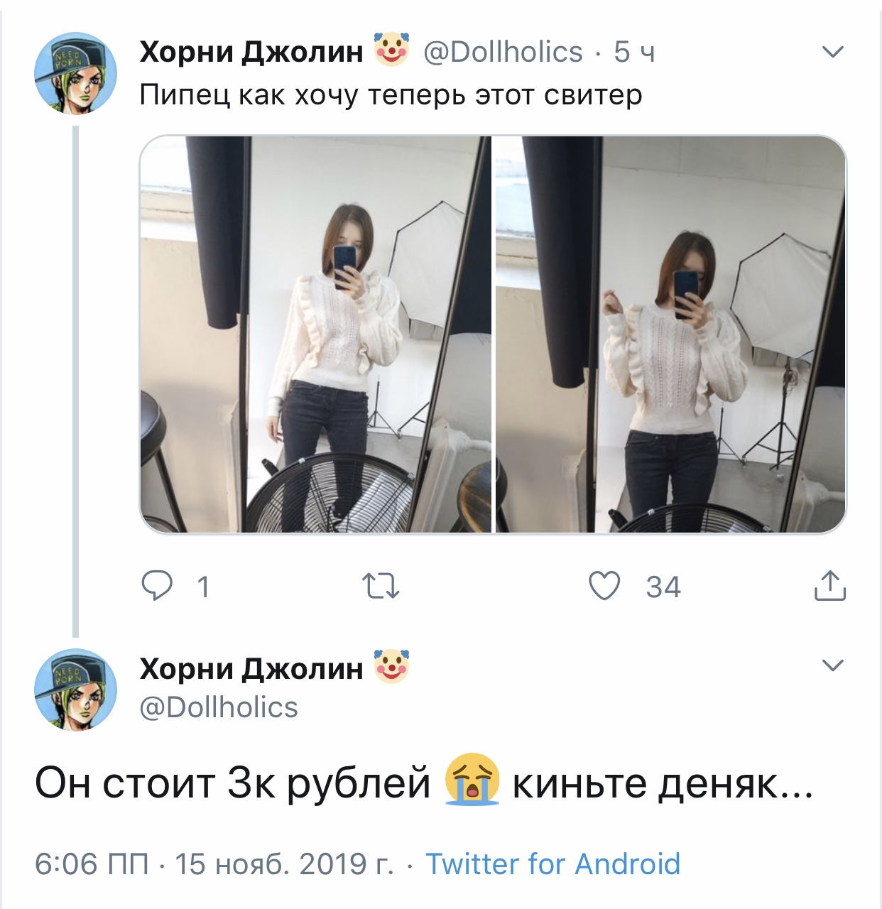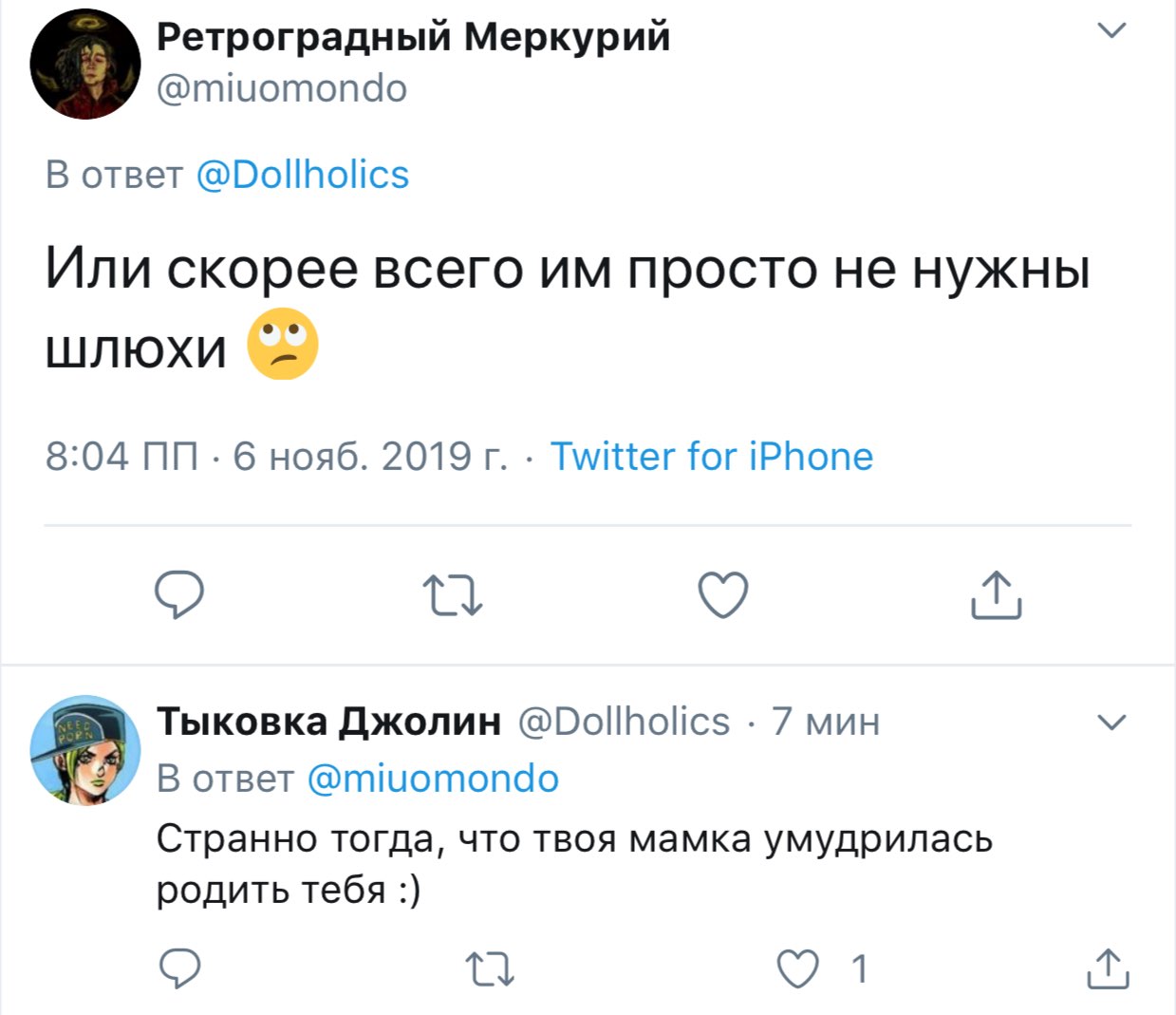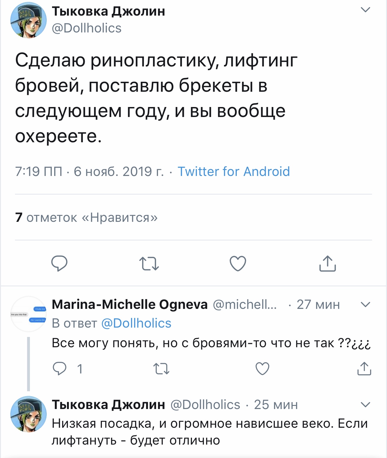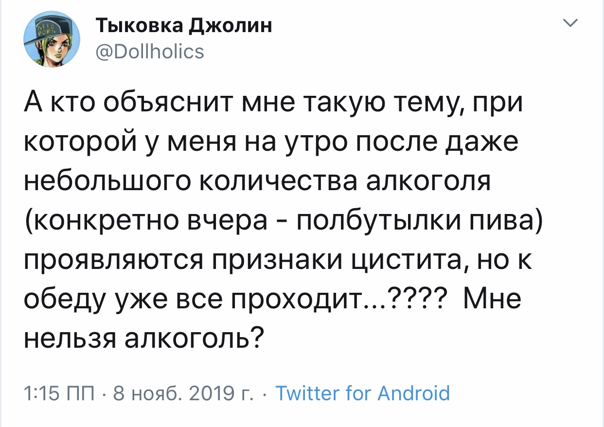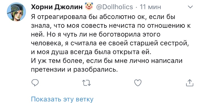 Вот блять такая я прям дура, что поверю в это. С меня хватит. Показать эту ветку Хорни Джолин @Dollholics · 16 мин Алиса, найди, пожалуйста, оправдание, звучащее ПОРЕАЛИСТИЧНЕЕ, я не дура. Ты давно меня нигде не фолловишь, чтобы мой твиттер, полный "негатива, жалоб, злости, скандалов" тебя хоть как-то касался.