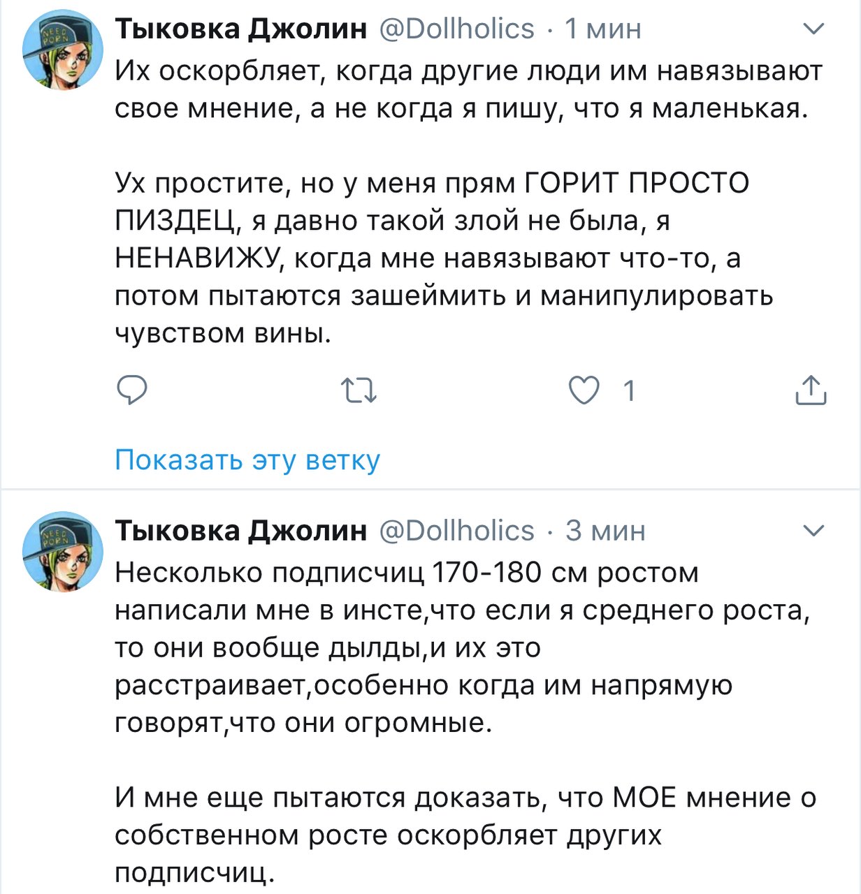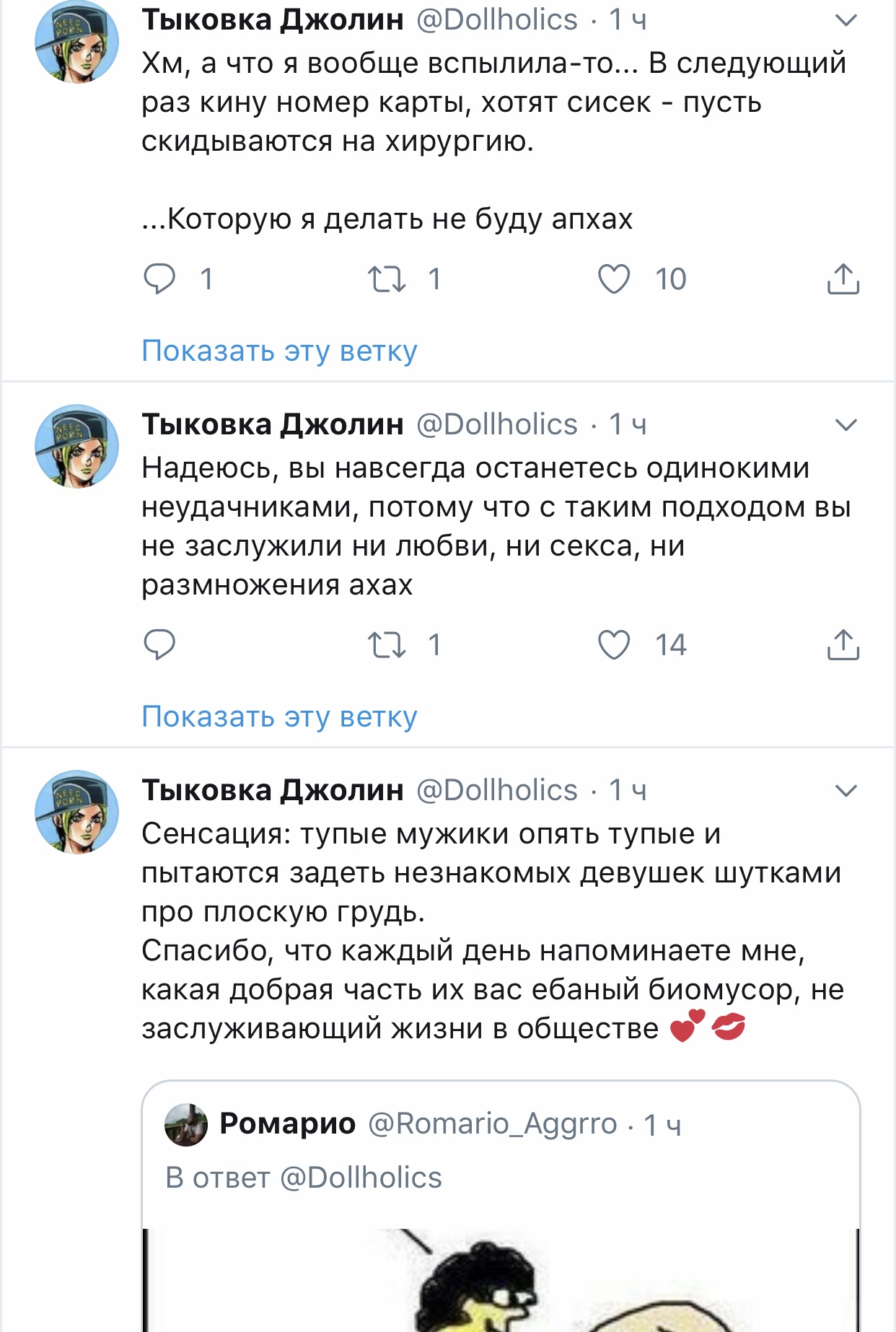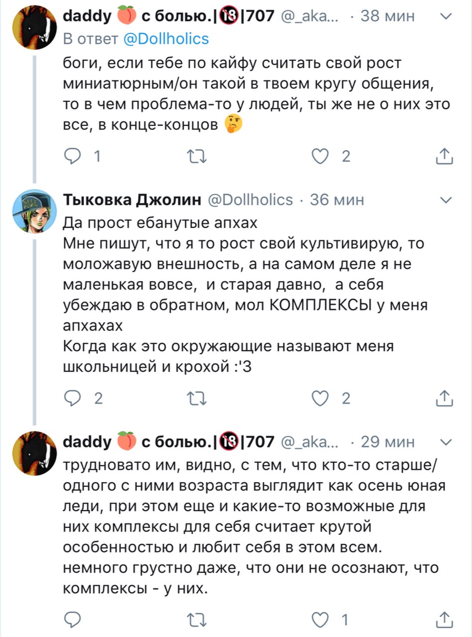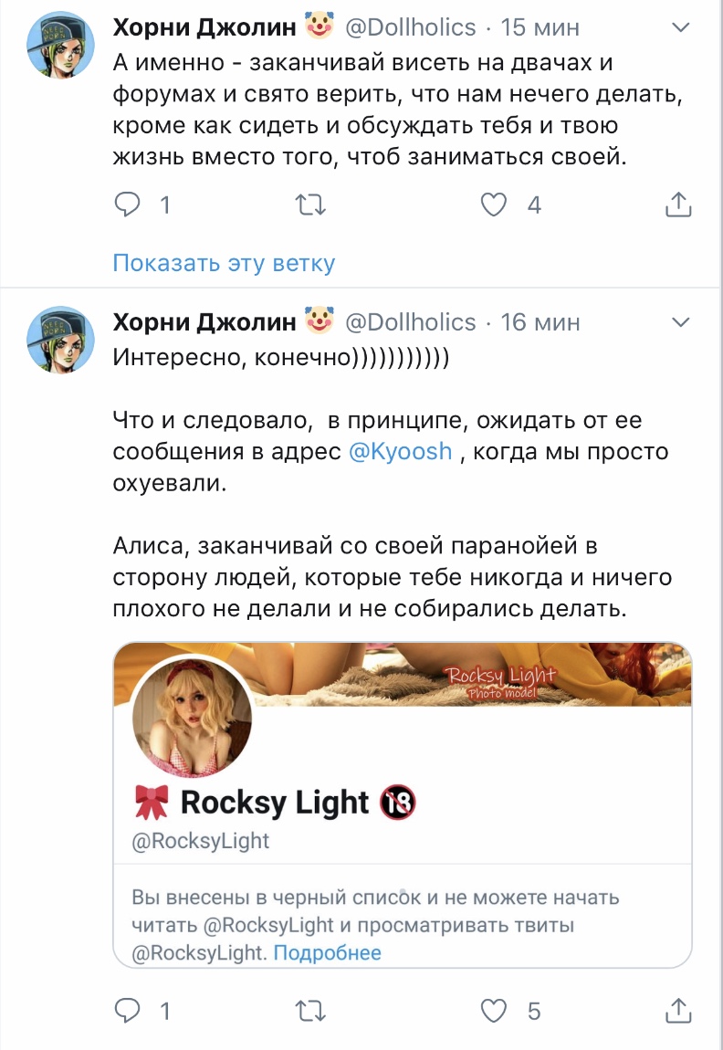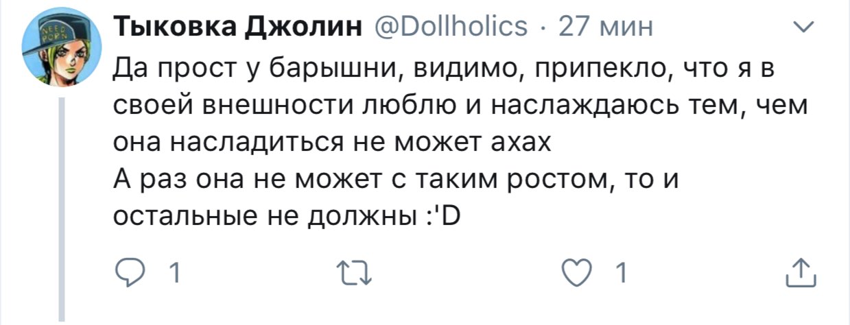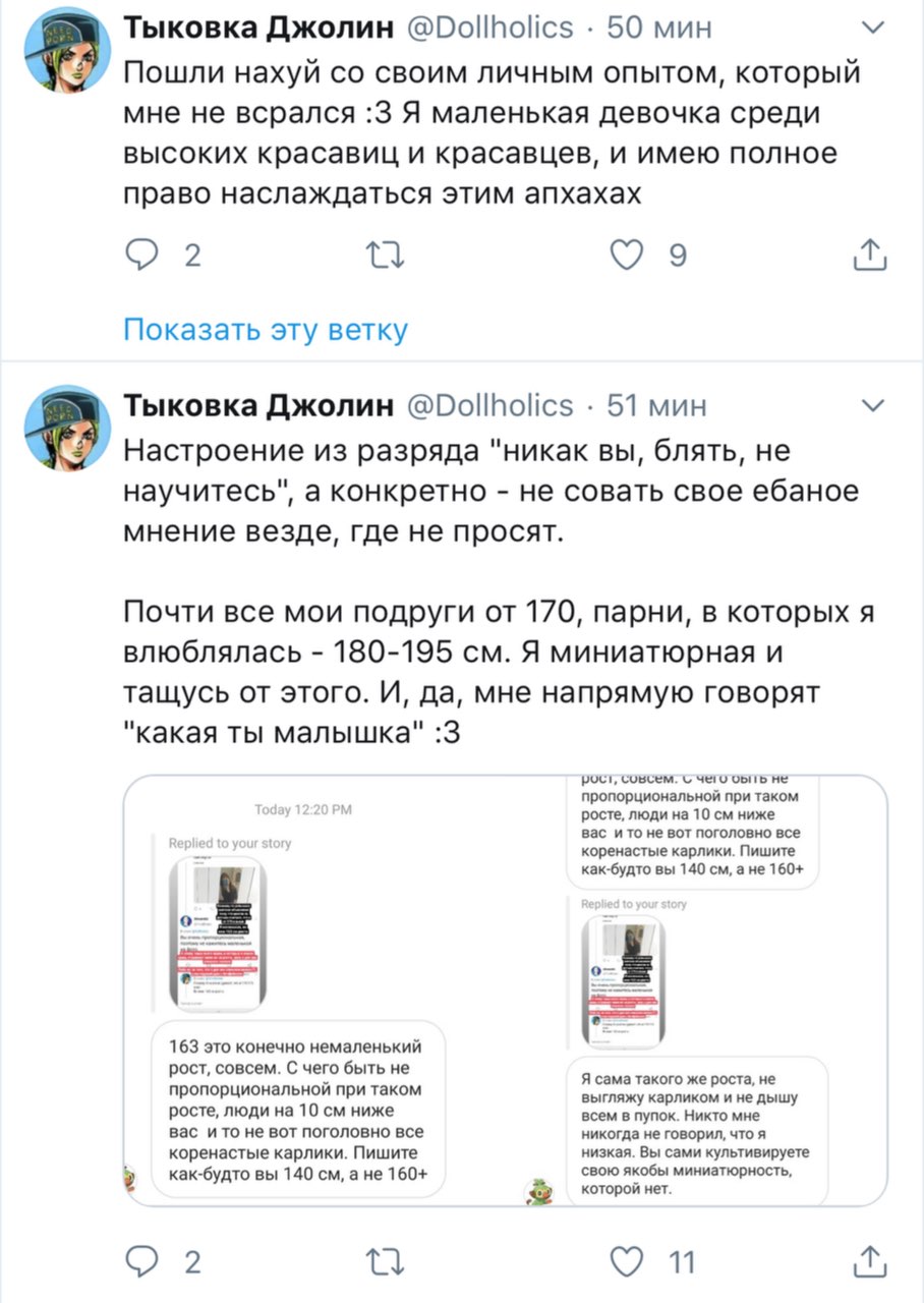 Решетеева Дарья, прекрати уже сталкерить меня, просматривать мой твиттер и мои стори. Ты вынуждаешь меня везде тебя заблочить. суперпозиция усталости @nyanyakonya В ответ @Dollholics Так у нее двач головного мозга, вряд ли такие призывы работают в этих случаях 1:01 ПП · 30 апр. 2018 г. 2 отметки «Нравится» Тыковка Джолин 30 апр. 2018 г. В ответ @nyanyakonya Я и так ее везде от себя отписала, но она даже после этого продолжает сталкерить. В инстаграме уже пришлось блокнуть, ибо надоело.