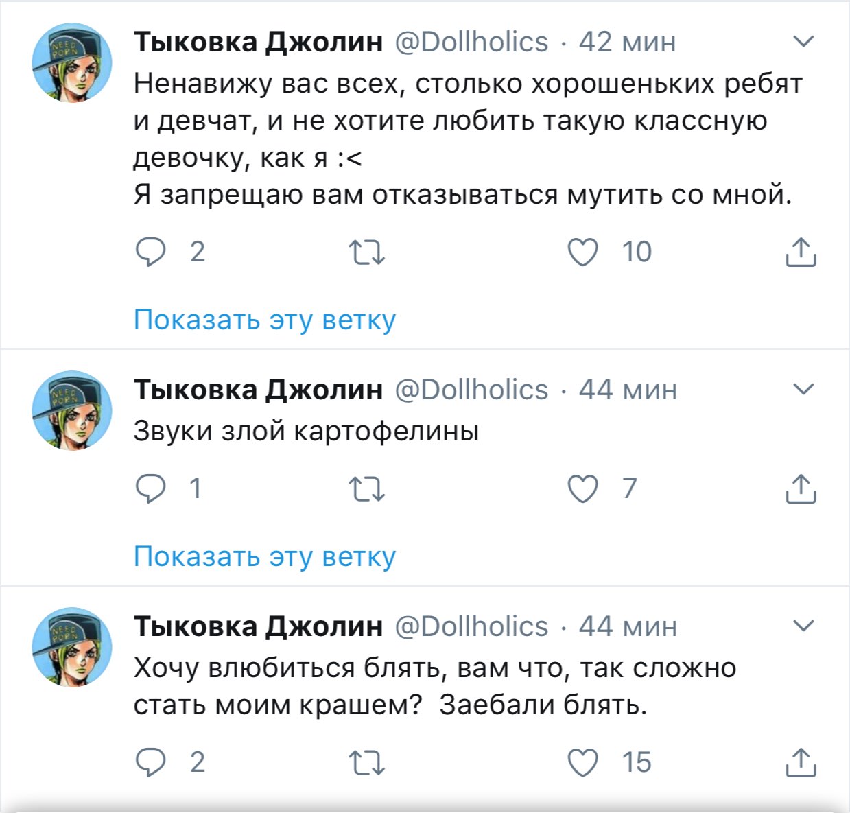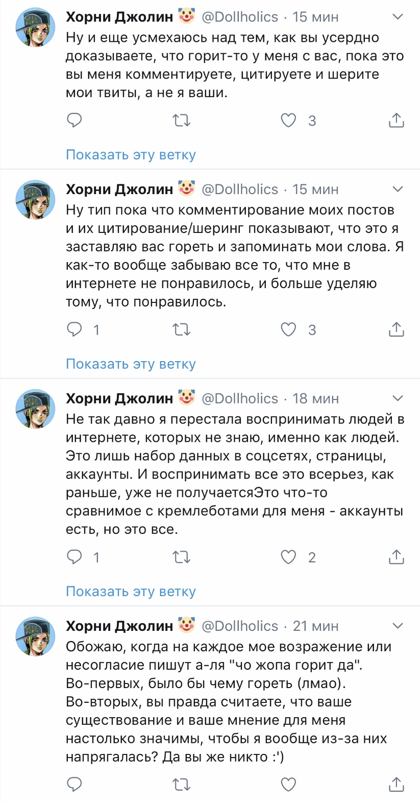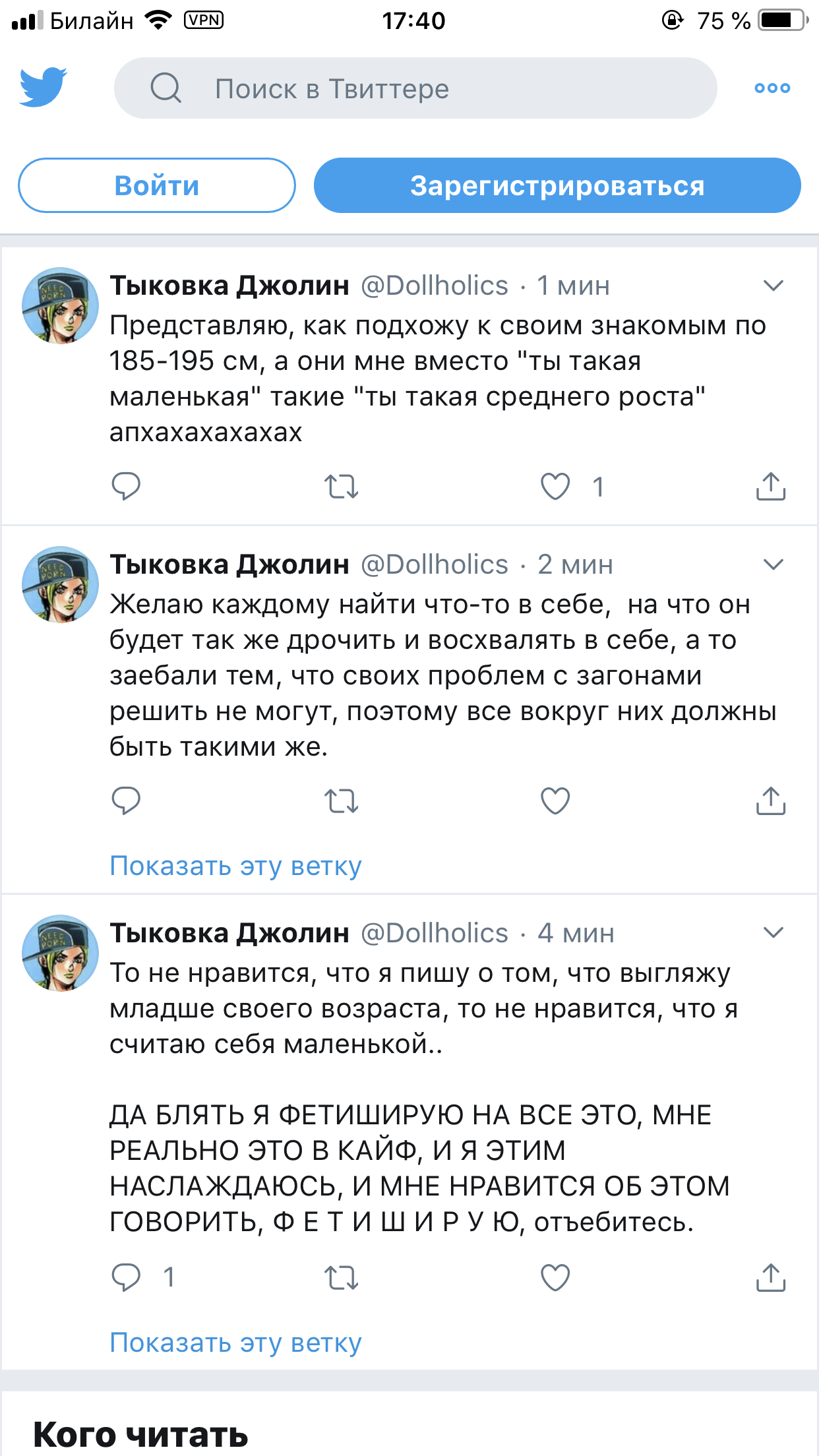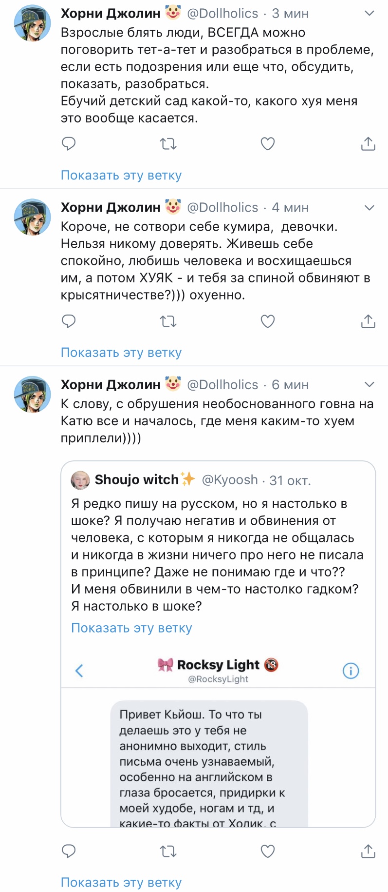 Решетеева Дарья, прекрати уже сталкерить меня, просматривать мой твиттер и мои стори. Ты вынуждаешь меня везде тебя заблочить. суперпозиция усталости @nyanyakonya В ответ @Dollholics Так у нее двач головного мозга, вряд ли такие призывы работают в этих случаях 1:01 ПП · 30 апр. 2018 г. 2 отметки «Нравится» Тыковка Джолин 30 апр. 2018 г. В ответ @nyanyakonya Я и так ее везде от себя отписала, но она даже после этого продолжает сталкерить. В инстаграме уже пришлось блокнуть, ибо надоело.