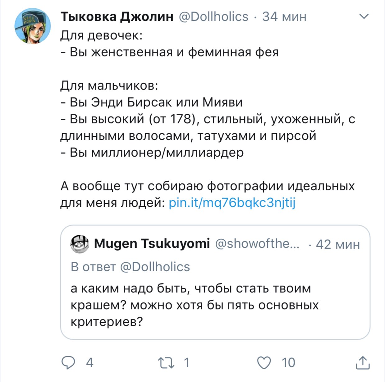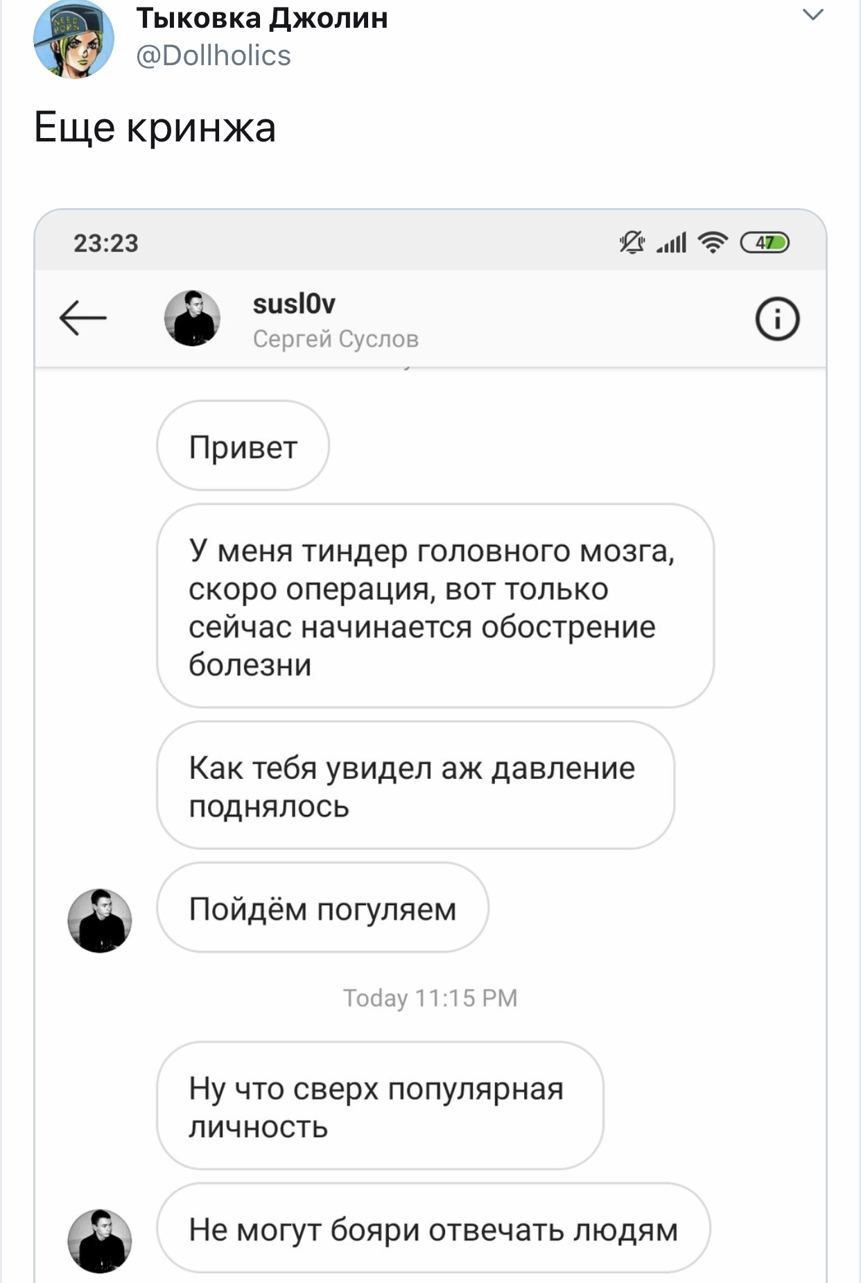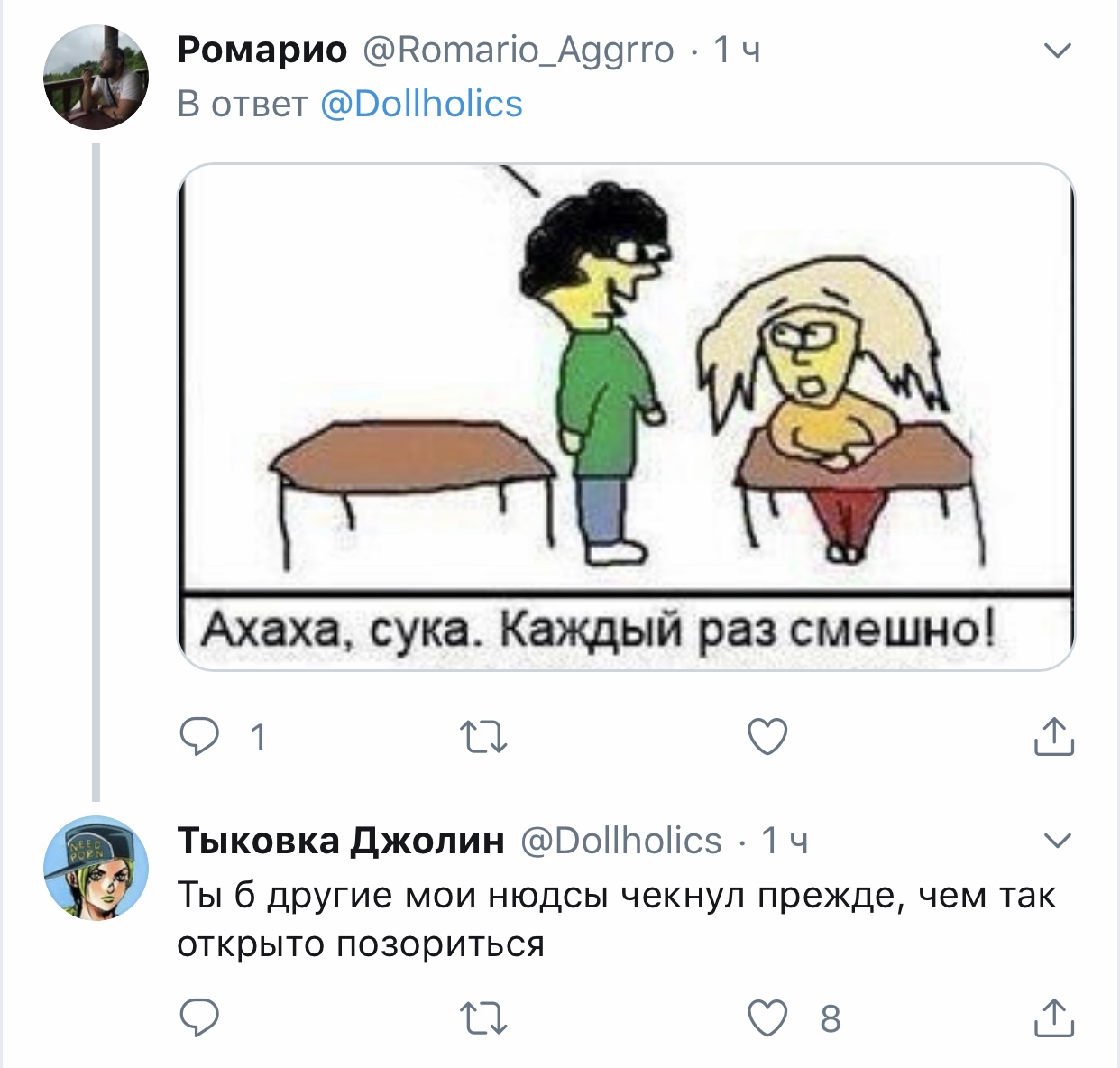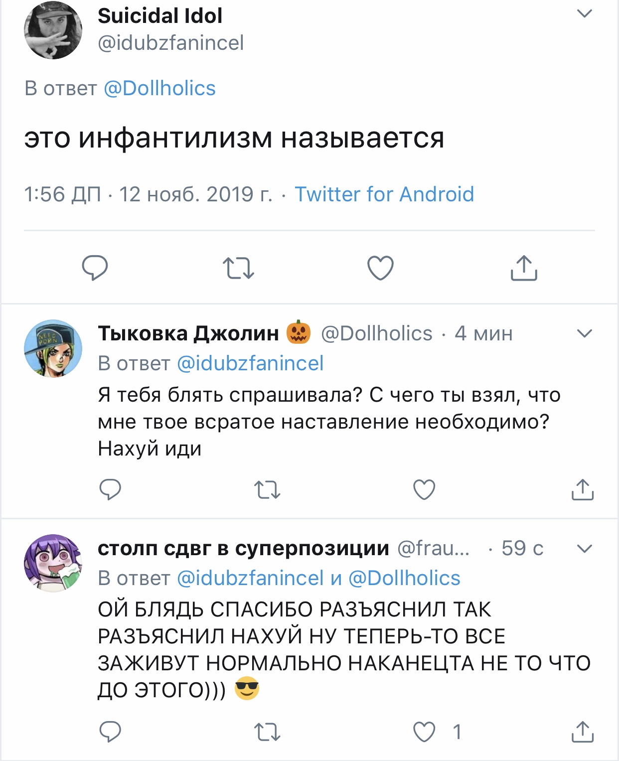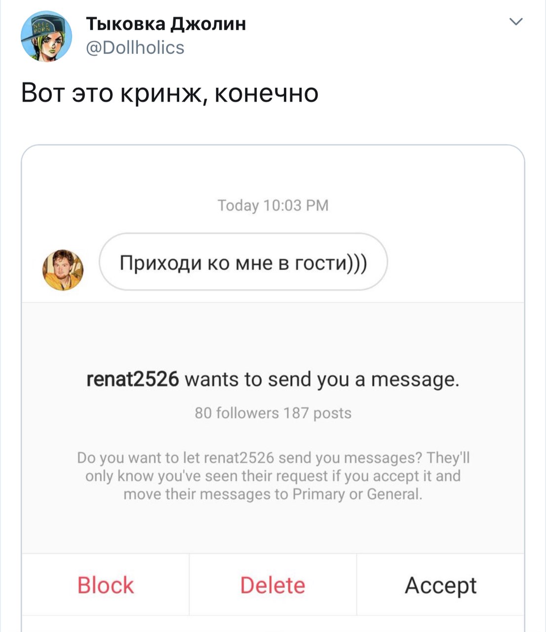 Решетеева Дарья, прекрати уже сталкерить меня, просматривать мой твиттер и мои стори. Ты вынуждаешь меня везде тебя заблочить. суперпозиция усталости @nyanyakonya В ответ @Dollholics Так у нее двач головного мозга, вряд ли такие призывы работают в этих случаях 1:01 ПП · 30 апр. 2018 г. 2 отметки «Нравится» Тыковка Джолин 30 апр. 2018 г. В ответ @nyanyakonya Я и так ее везде от себя отписала, но она даже после этого продолжает сталкерить. В инстаграме уже пришлось блокнуть, ибо надоело.