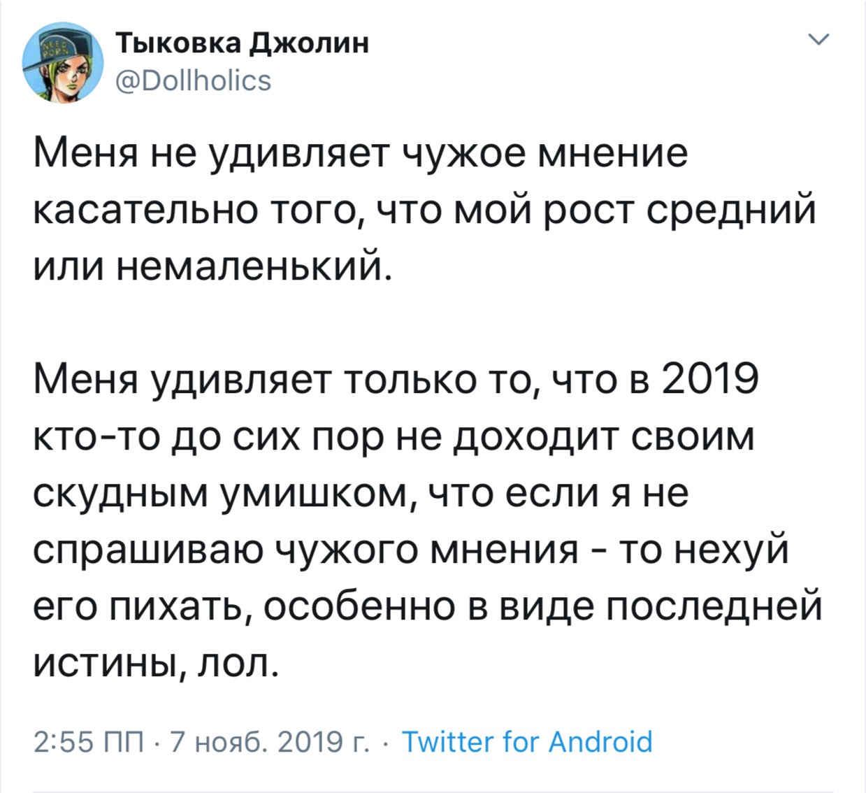 В ответ @Dollholics Это же двач, камон, там такую ересь несут...У меня такая форма жизни как двачер в голове не укладывается - недостаточно я мудрая, может)0)0 Меня тоже любят пообсирать на дваче, порой и личная инфа проскальзывала туда. Проще забить и быть выше этого,ведь написанное там - хуйня.