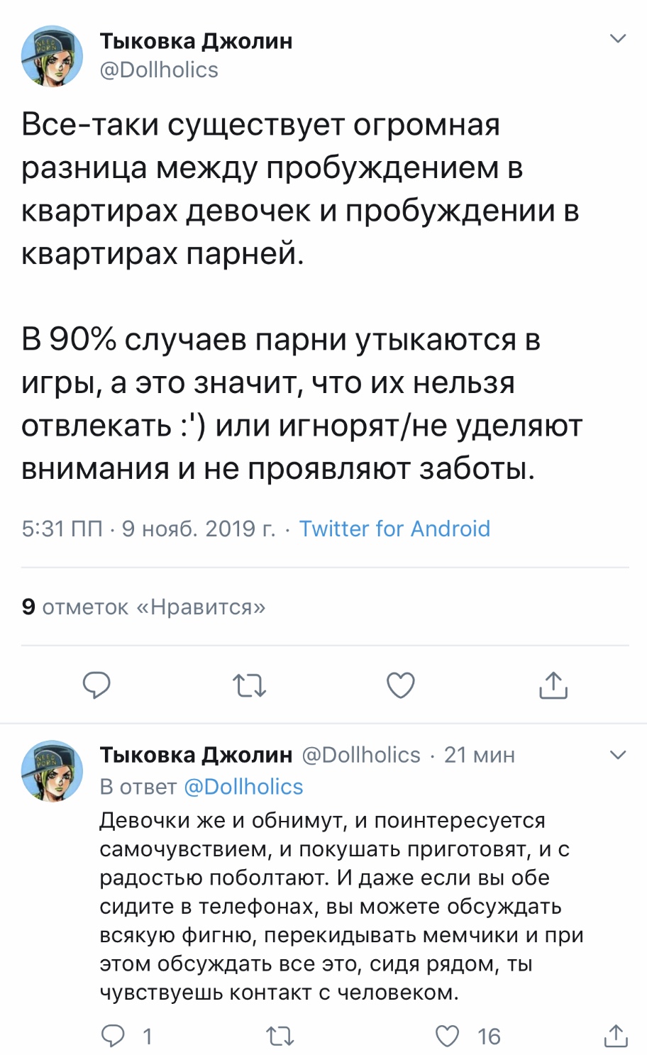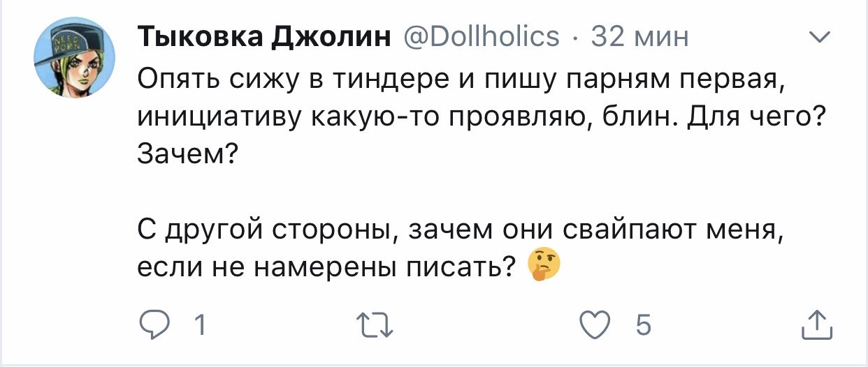 Хорни Джолин @Dollholics · 21 мин Тащу домик для кошек к метро, обливаясь потом. Мимо проходит высокий и крепкий на вид парень, оборачивается и восклицает "Ого, какая маленькая и сильная!". Первая мысль: да, такая вот я сильная и независимая умница Вторая мысль: ...но лучше бы ты, блять, предложил помощь