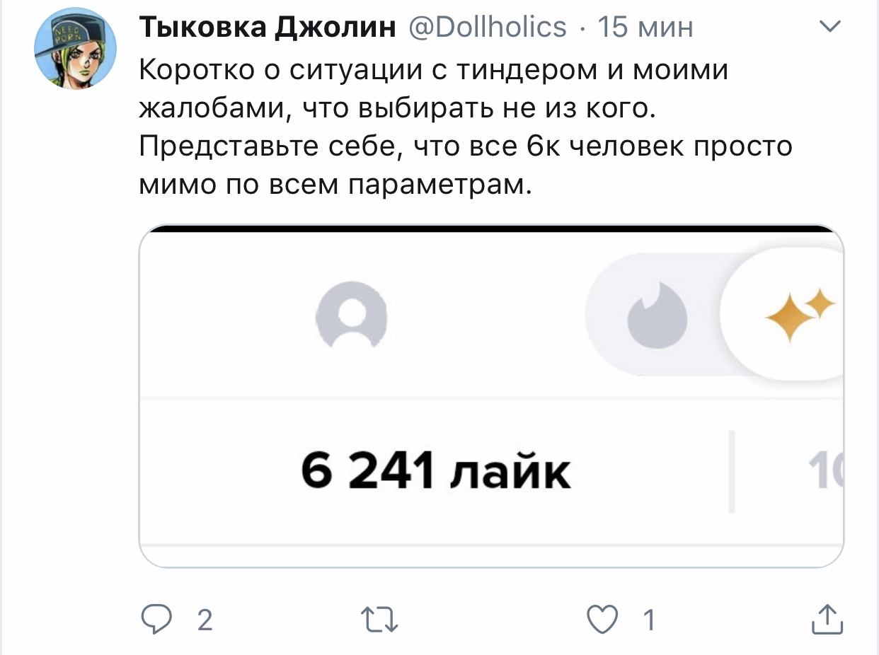Тупая пизда реально не понимает как работает Тиндер? И что среди этих лайкнувших её 6000 мужиков просто нет тех нормальных людей, которые обошли её стороной?))))) Ебать кричу)))))