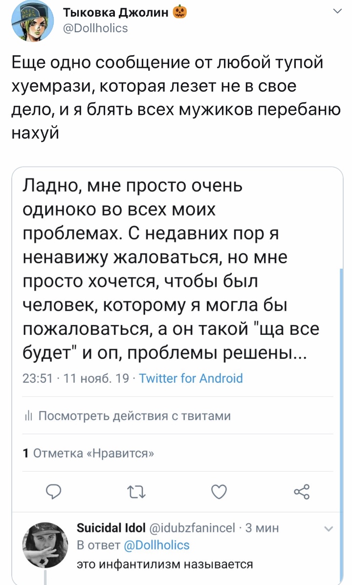 >>59940 >>59941 Ладно, раз уж сегодня я пиздец депрессивная и грустная, позволю себе написать, что я ненавижу маму Дани, и наконец-то у меня нашлись силы признать это, а не подавлять эту ненависть в себе. 7:47 ПП · 20 нояб. 2019 г. 6 отметок «Нравится» Marina-Michelle Ogneva @michelleduval7 · 9 мин В ответ @Dollholics Ну это нормально и все твои читатели, которые хоть немного читали о том, что происходило - ненавидят маму Дани