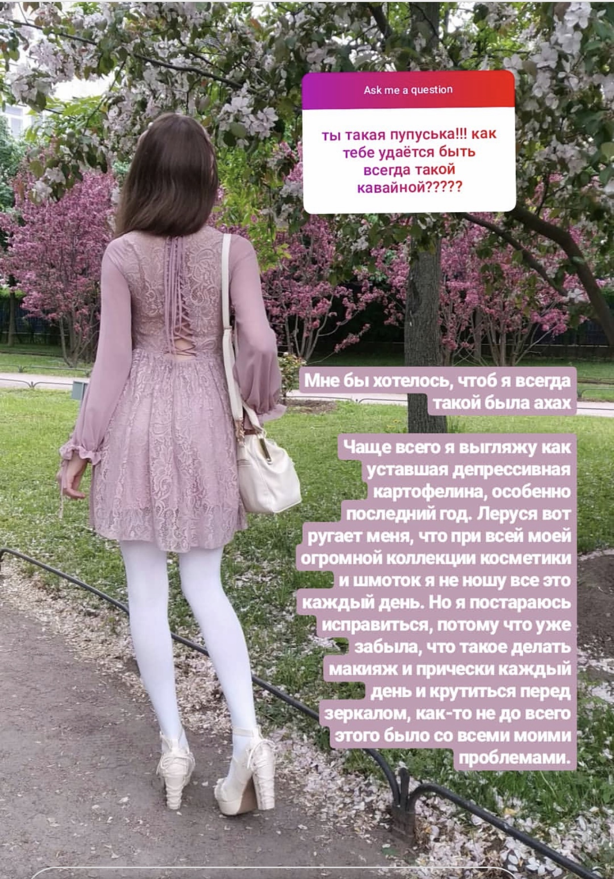 Вафля реально такое странное существо, говорить что-то про перфекционизм и эстетику в повседневной жизни, идеальный подбор ею всего чего только можно, а сама реально как была сто лет назад неопрятной, так и осталась. Волосы как насадка на швабру вечно, бегает две недели с отслоившимся ногтем, пальцы в заусенцах, вся одежда постоянно в катышках была, а теперь еще и в волосах кошачьих, макияж деградирует, в сочетаемость вещей совсем уже не может, хотя и раньше было не ахти. Но все какие-то фантазии о том, как она станет классной, и все её бывшие хахали и подрушки пожалеют. Вангую успех Нигею, потому что большинство расставшихся с ней людей сейчас преуспевают, что даже не удивительно.