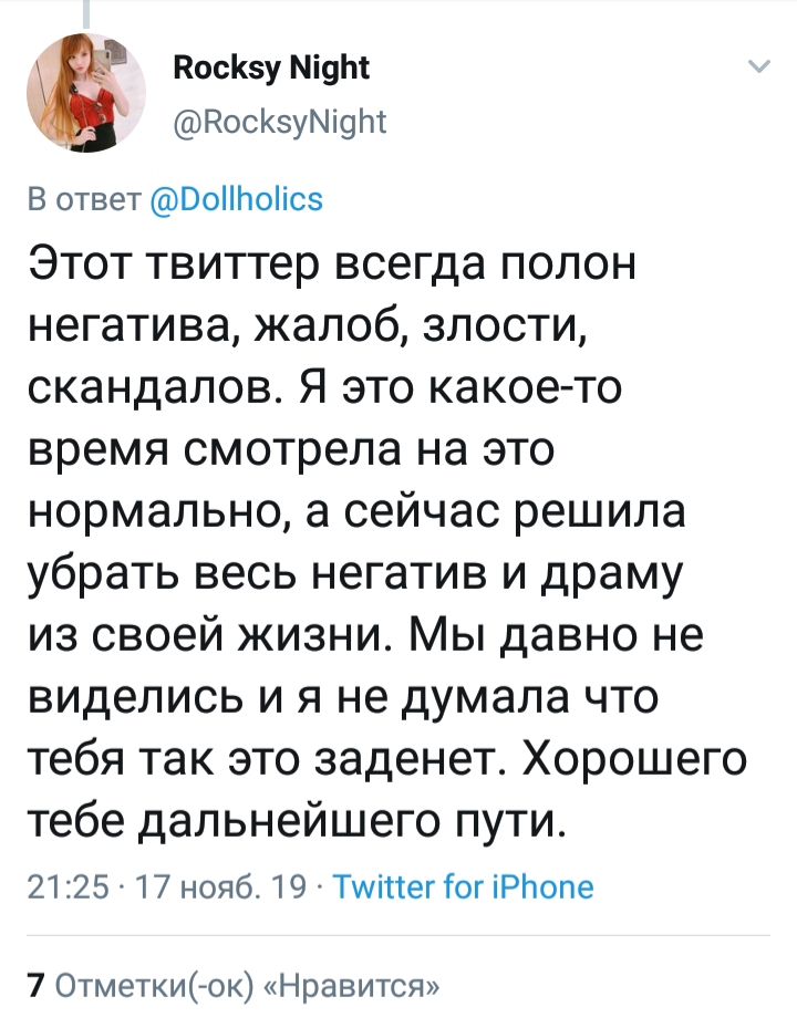 >>59855 Rocksy Night @RocksyNight В ответ @Dollholics Этот твиттер всегда полон негатива, жалоб, злости, скандалов. Я это какое-то время смотрела на это нормально, а сейчас решила убрать весь негатив и драму из своей жизни. Мы давно не виделись и я не думала что тебя так это заденет. Хорошего тебе дальнейшего пути.
