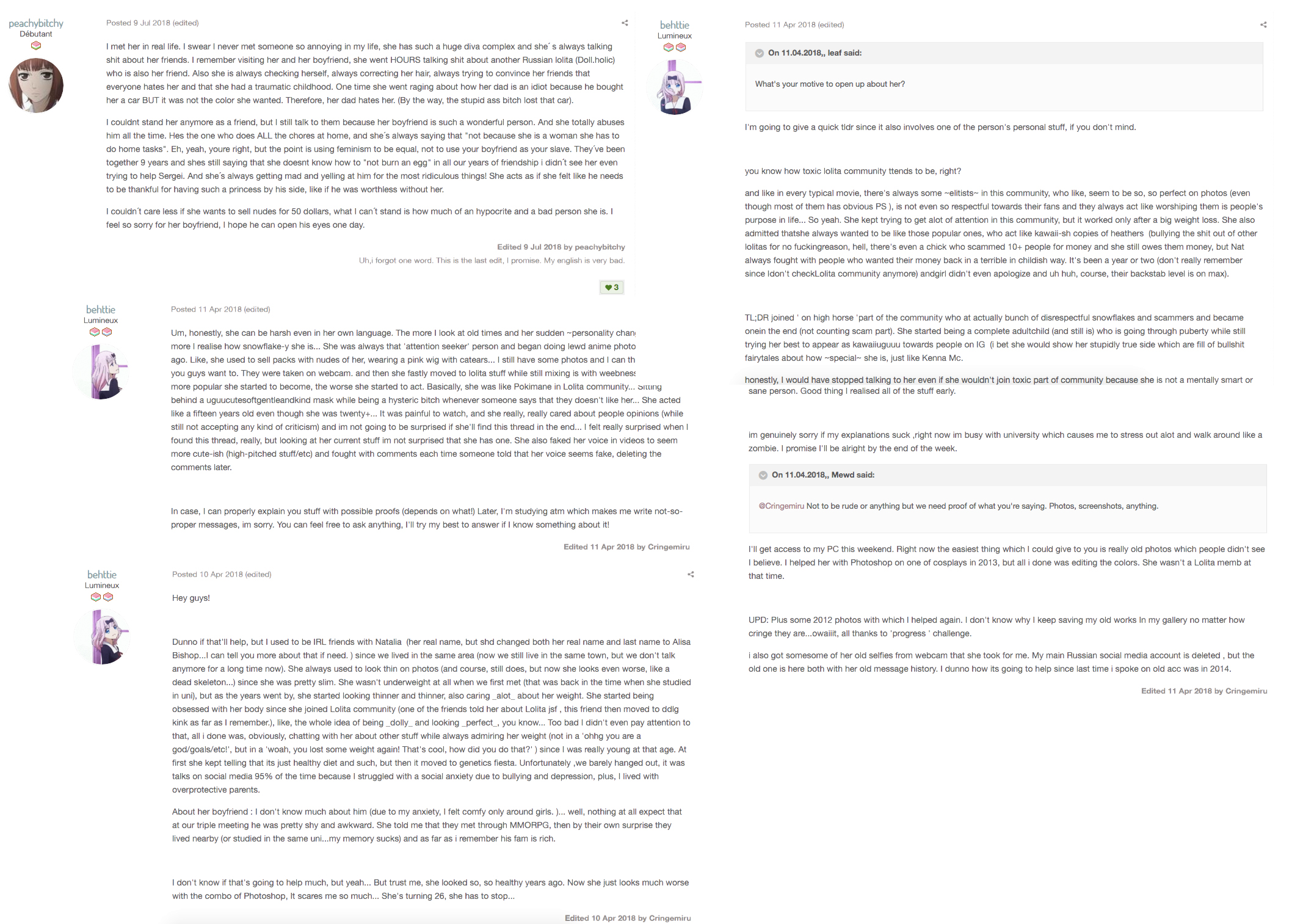 И это не считая количества людей, с которыми Вафля успела посраться. За глаза полить всех говном, выставляя себя жертвой, а других крысами, агрессорами и абьюзерами. Завидуя даже собственной сестре, которую она завуалированно обсирает, чтобы поднять свою самооценку.