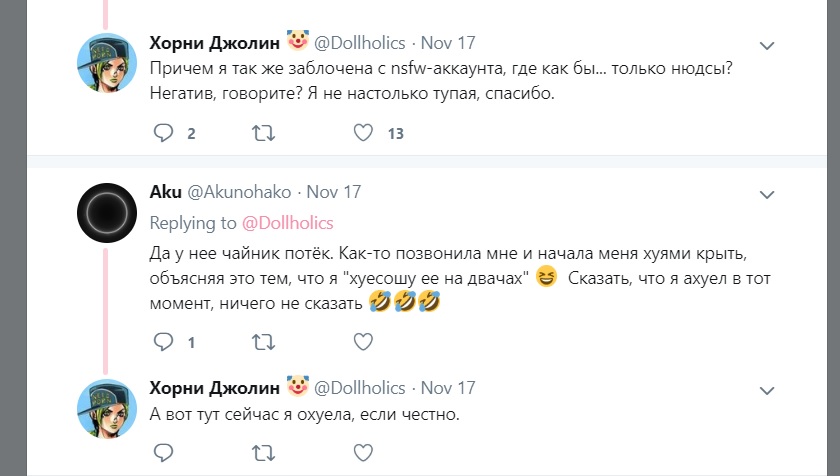 Причем я так же заблочена с nsfw-аккаунта, где как бы... только нюдсы? Негатив, говорите? Я не настолько тупая, спасибо. Показать эту ветку Хорни Джолин @Dollholics · 14 мин Странно, что при этом встречи с друзьями, полные негатива, жалоб и злости на других людей, ее не напрягали, а мой твиттер, с которым человек никак не взаимодействовал, напрягал.