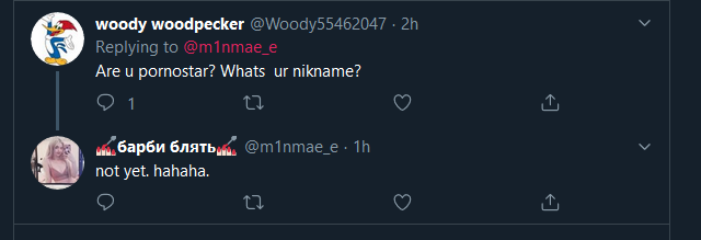 >>59650 В чём "кринж"? Весь день ноет, что парни не пишут ей первыми и что она хочет внимания. Вот ей пишет человек, с обычным вопросом – логичное следствие её твитов. А она – "кринж". Тупая какая-то...