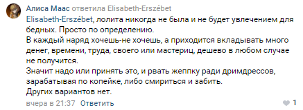Это как плакаться, что хочешь лакшери жизнь, а денег нет. Можно было выбрать более "бюджетные" стили, наверняка не только лолита нравится. У меня лолита ассоциируется с хорошими денежными вложениями, если реально хочется сочинять красивые и интересные коорды.