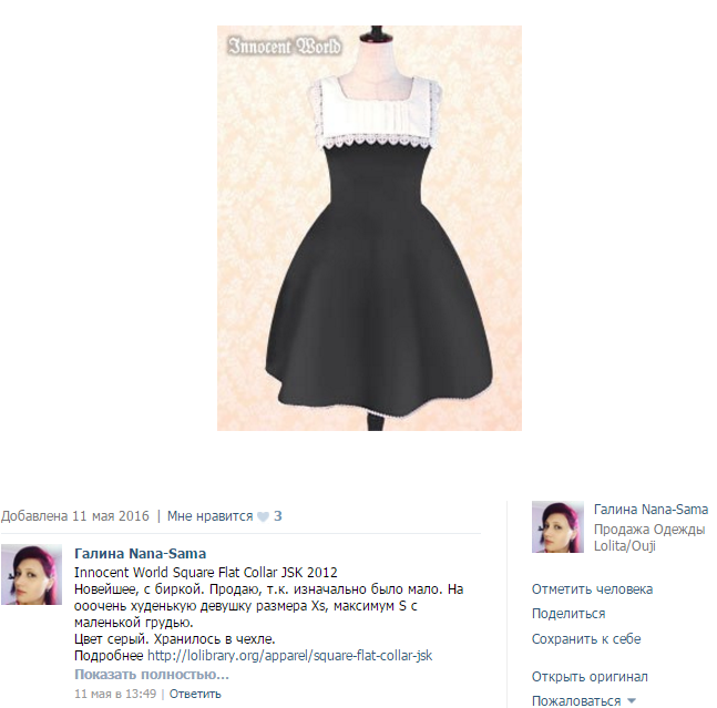 >>62558 Да нет, не лучше. В идеале, я должна увидеть, как на живой женщине сидит одежда, которая ей по размеру, чтобы решить для себя, нужна мне эта вещь или нет, а потом подобрать себе размер по размерной таблице. Я не хочу и не должна думать: "вот, на модели это платье висит мешком, а она, наверное, худая (насколько?), а раз я жирная, то мне, наверное, будет, норм". Я хочу видеть, как именно должно сидеть платье, как его задумал производитель. В лолите это не так актуально, как в мори-кей или бохо с его свободными силуэтами и фрисайзами, но все же актуально. Я не должна ничего прибавлять или вычитать, как я должна измерить и взвесить модель по фото, чтобы понять, насколько она меньше или больше, чем я? Спасибо некоторым китайцам, которые просекли фишку и фотографируют вещи на разных моделях, в том числе относительно высоких и не совсем худых, и подписывают их параметры, это хоть как-то помогает определиться.
