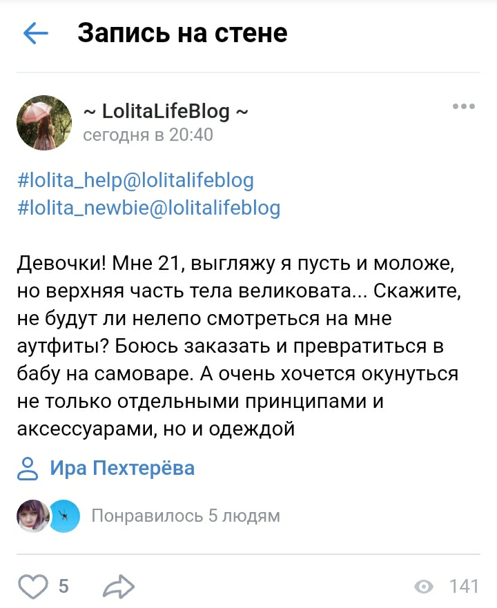 Раз зашла речь об обсуждениях, которые как-то стесняешься забросить в соо. Хочу поделиться с благородными леди наблюдением. Классическая и широ лолита ассоциируется у меня с чем-то спокойным, аристократичным, радостным. Первая ассоциациями с этими понятиями - девушка или женщина здорового телосложения, которая идёт вдоль аллеи и несёт в сумочке шоколадное печенье. При этом когда я вижу паблики винтажно-кукольной тематики, которые в атрибутах типа общей стилистики блузок, украшений, мотивов рококо довольно похожи на лолиту, мне становится плохо. У них отвратительная болезненная энергетика. Одежда отдаёт тоской, а интерьеры чем-то могильным. В моей голове эта эстетика стойко связана с детской смертью и иногда терпким насилием. Кто-нибудь ещё замечал подобное?