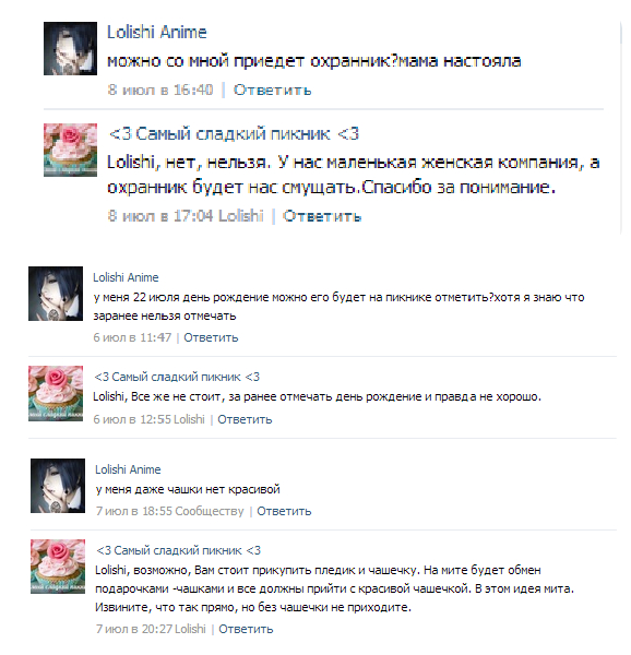 Пошла посмотреть встречу пикника, про который столько толкуют, увидела в напрашивающихся Каришу, проиграла на весь офис :,D Вы точно фулсет собрали, лол! Но я рада, что это сборище зашкварцев - не Кавайи Митс всё-таки. У Кавайи действительно милые лолитки собираются, жаль, что я слишком старуха, чтобы присоединится к няшам
