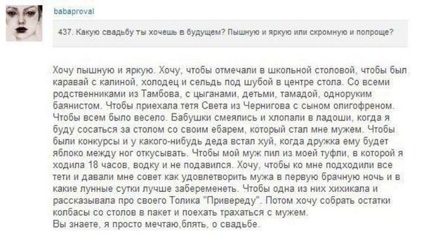 >>7510 > чтобы ко мне подходили все тети и давали мне совет как удовлетворить мужа в первую брачную ночь и в какие лунные сутки лучше забеременеть > собрать остатки колбасы со столов в пакет Ооооо, точняк, самое главное забыла, спасибо, сис.