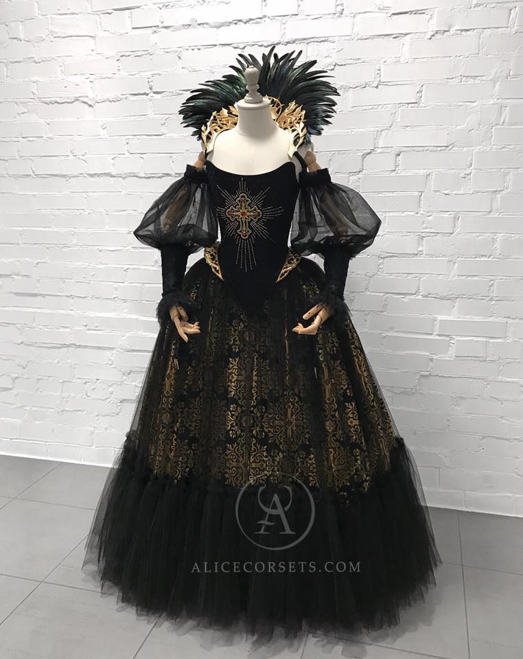 >>64943 Очень сильно перекликается одно с другим. Черная вуаль поверх церковной парчи, бархатный лиф с вышитым рисунком, даже рисунок очень похож, но надо гуглить, чтобы найти, что там конкретно миссданжер использовали. Вполне возможно, создатель второго решил, что ему нравятся все сочетания цветов, мотивов и материалов, и он натянет это на фасон бального платья.