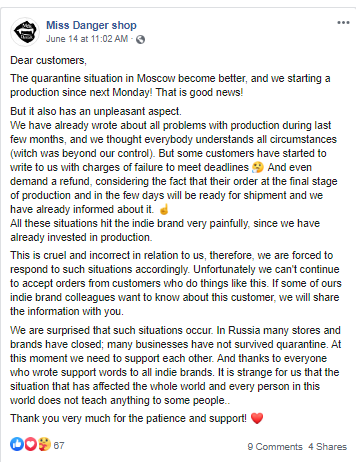 >>64965 А то на /cgl от них бомбятся сейчас. Мол, они проебал все сроки и дедлайна, и выкатили сейчас на фб пост, где обвиняют во всем ковид и жалуются на покупателей, которые потребовали возврат денег. И предлагают другим инди брендам раскрыть информацию о том, кто эти нехорошие люди, которые за свои кровные деньги хотят, чтобы бренд не пропадал на полгода без вестей.